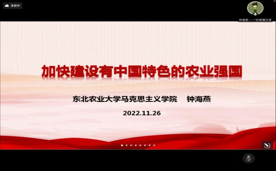 本次论坛邀请13位专家学者作报告。山西农业大学马克思主义学院武星亮教授,华中农业大学马克思主义学院院长梁伟军教授,河北农业大学马克思主义学院党委书记贾立平教授,云南农业大学马克思主义学院王飞教授,我校现代农业发展研究中心主任郭翔宇教授,经济管理学院院长张启文教授,公共管理与法学院院长杜国明教授,马克思主义学院钟海燕副教授、胡万庆副教授以及马克思主义学院青年教师代表侯坤、顾尔康、张峰、李梦,紧紧围绕农业农村高质量发展这一主题,聚焦了关于农业农村高质量发展的一些认识、中国式现代化道路的形成历程、实践特征与世界意义、乡村振兴是农业农村高质量发展的必然选择、坚持农业农村优先发展,着力补齐“三农”短板、推进农业高质量发展,以农业强省支撑农业强国建设、农业保险助推农业高质量发展、典型黑土区耕地细碎化的理论解析与应对策略、加快建设有中国特色的农业强国、新时代供销合作社助力乡村振兴的思考、以新发展理念引领农业高质量发展,推进质量龙江建设、加强中俄区域农业合作,提升保障粮食安全能力、粮食安全与农民教育、习近平关于保障农民利益重要论述的三重维度等问题,结合党的二十大报告中的新观点、新思想、新论断作了专题报告。与会专家以宽广的视野、严谨的治学精神、深厚的理论功底、富有创新的思想观点,呈现了一场主题突出、内容丰富、严谨务实的学术盛宴。