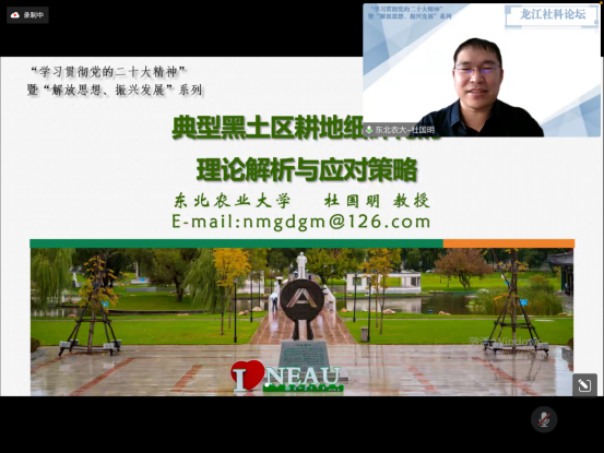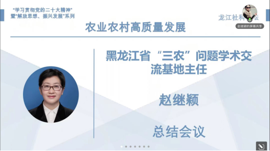 赵继颖在总结中指出,党的二十大报告为农业农村高质量发展指明了方向,引起了全国“三农”研究工作者们的热烈反响,专家学者们纷纷表示要在乡村振兴的新征程上,加快实现农业农村现代化,促进乡村全面振兴。省社科联通过举办“学习贯彻二十大”系列龙江社科论坛,为专家学者提供了学术交流、思想碰撞的平台与机会。本次学术论坛奉献出一场精彩纷呈的思想和学术盛宴,激发“三农人”广泛参与学术交流、理论研究和咨政服务的积极性,彰显了“三农人”的初心使命和学术担当,为服务社科人才培育、“三农”问题研究成果产出,以及服务国家战略需求和龙江振兴发展大局做出了积极贡献。黑龙江省“三农”问题学术交流基地紧紧围绕国家所需、龙江所要、学校所能和未来所向,主要聚焦我省“三农”发展中的理论与实践问题,致力于在粮食安全、乡村治理和农业现代化等方面的研究成果,更好地服务于我省的经济建设、社会发展和社会科学事业,为奋力谱写全面建设社会主义现代化国家的龙江新篇章提供扎实的学理支撑。