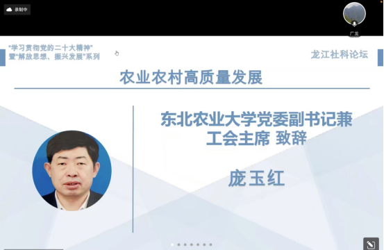 庞玉红在致辞中指出,党的二十大刚刚胜利召开,习近平总书记在大会上所作的报告擘画了未来、全面描绘中华民族伟大复兴光辉前景,报告把农业农村问题放在优先发展位置,指出全面建设社会主义现代化国家,最艰巨最繁重的任务仍然在农村。要加快建设农业强国,扎实推动乡村产业、人才、文化、生态、组织振兴。黑龙江作为农业大省,既要当好国家粮食安全“压舱石”,也要争当农业现代化建设排头兵。省委十三届二次全会要求全省各界全面准确学习领会党的二十大精神,坚定不移把党的二十大作出的战略部署落到实处。学习宣传贯彻党的二十大精神是当前和今后一个时期全党的首要政治任务,全省社科理论界全面贯彻落实中央和省委安排部署。自10月28日起,省社科联主办以 “学习贯彻党的二十大精神”为主线的系列龙江社科论坛,组织全省社科工作者开展党的二十大精神的研究阐释、宣传宣讲、咨政建言等活动,引领全省社科界同仁们助力龙江社会科学繁荣发展,增进全国“三农”研究工作者的学术交流,形成热爱龙江、唱响龙江、振兴龙江的强大合力。本次论坛的主题是黑龙江省“三农”问题研究学术交流基地聚焦和研究的领域所在,希望通过这次论坛发挥龙江社科同仁作为思想智库的积极作用,推出一批有分量的高质量研讨成果,把党的二十大精神落实到社科界工作各方面,着力用党的二十大精神统一思想、凝聚力量,奋力谱写全面建设社会主义现代化国家龙江新篇章!