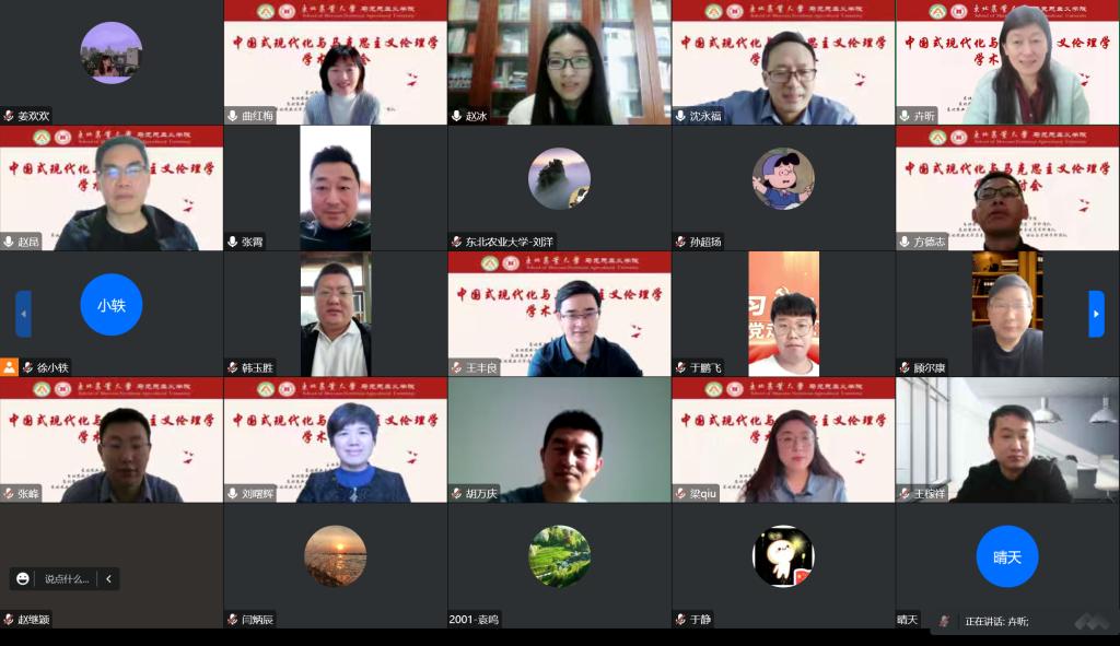 11月27日,我校苏俄伦理学研究团队在线召开了“中国式现代化与马克思主义伦理学”学术研讨会。本次研讨会由我校马克思主义学院、苏俄伦理学研究团队、思想政治教育创新与发展学科团队、马克思主义“三农”理论与实践学科团队、国家社会科学基金重大项目《俄罗斯近现代伦理思想史研究》课题组共同主办。首都师范大学马克思主义学院院长沈永福教授、清华大学马克思主义学院副院长李义天教授、中国人民大学哲学学院副院长张霄教授、吉林大学哲学学院副院长曲红梅教授,浙江师范大学人文社科处处长、双龙学者特聘教授冯昊青,温州大学马克思主义学院瓯江特聘教授方德志、《哲学动态》与《中国哲学年鉴》副编审冯书生,《马克思主义研究》编辑、中国社会科学院马克思主义研究院副研究员刘曙辉,《齐鲁学刊》主编、曲阜师范大学政治与公共管理学院教授赵昆,校“三农”理论与实践学科团队负责人吴玲教授,校苏俄伦理学研究团队负责人、国家社会科学基金重大项目首席专家武卉昕教授,马克思主义学院副院长赵继颖以及马克思主义与伦理学问题研究领域的专家学者和我校马克思主义学院师生120余人参加会议。我校马克思主义学院院长许静波主持开幕式并致辞。