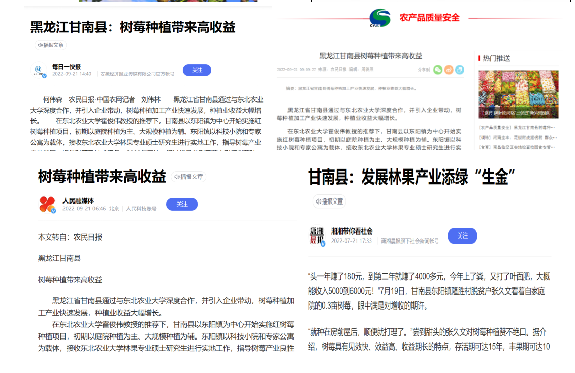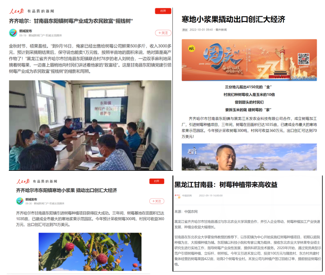 社会合作与成果转化中心(新农村发展研究院)与校县共建寒地小浆果产业联盟专家共同收集黑龙江省内适宜主栽的寒地小浆果品种,在东阳镇建立齐齐哈尔市最大的寒地浆果示范园区,集中展示了红树莓、蓝靛果、黑加仑等28种寒地小浆果。同时,充分融合学校专家的技术力量和品种优势发展红树莓产业,从最开始11名党员带头庭院种植几十亩,发展达到了上千亩,1400平方米冷冻工厂投入生产。2022年,采收红树莓近300吨,村民收益近400万元,出口创汇达50万美元。经过不懈努力,红树莓种植让东阳镇脱贫群众致富,为甘南县发展庭院经济产业找到了一条特色之路。