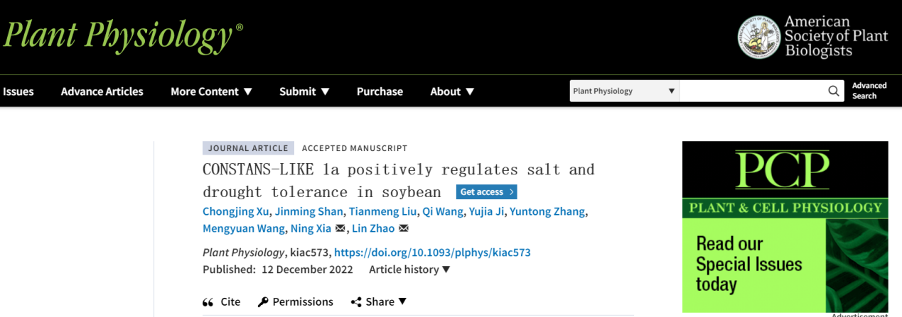 12月12日,我校农学院大豆生物学教育部重点实验室赵琳课题组在国际知名期刊《Plant Physiology》(IF=8.005,中科院1区Top期刊)在线发表了—“CONSTANS-LIKE 1a positively regulates salt and drought tolerance in soybean”的研究论文,阐明了大豆GmCOL1a调控大豆耐盐和抗旱信号传导分子机制。东北农业大学博士研究生许崇晶为第一作者,该研究得到国家重点研发计划“揭榜挂帅”项目、国家自然科学基金面上项目和黑龙江省自然科学基金重点项目资助。