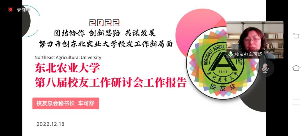 会上,车可舒代表学校校友总会秘书处作2022年度校友工作报告。报告以“团结协作 创新思路 共谋发展 努力开创东北农业大学校友工作新局面”为主题,从打造校友工作新格局,激发合作交流新活力,展现校友活动新风采,汇聚母校发展新力量四个方面对一年来校友工作进行了回顾与总结。并从加强内部建设,提升校友会工作“源动力”;优化组织管理,提升校友会工作“凝聚力”两大方面对未来工作提出了设想与展望。
