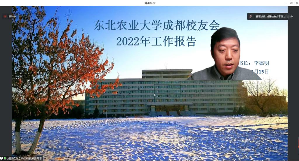 孙占峰代表学校在总结讲话中对各校友会一年来的工作给予了高度评价,并用三个“一”表达了对学校、对校友及校友工作的深切情谊。一是表达一份自豪。为自己是土生土长的东农人而自豪,为校友们秉承爱校情怀、发扬奉献精神积极投身于母校建设和国家服务中而自豪,为校友自身良好发展与取得的优异成绩而自豪。二是表达一份谢意。感谢校友一直关注关心母校发展,并以多种方式反哺母校,尤其在疫情期间,为母校募集资金,捐赠物资。母校的每一个进步足迹,每一次发展跨越,都有校友的付出和印记。三是表达一份期望。在未来的工作中,学校和校友总会将积极构建具有东农特色的大校友工作新格局,营造人人关心校友、人人参与校友工作的良好氛围。校友办要大力推动校友分会建设,积极搭建校友与母校共兴共荣平台。希望各校友分会更加团结务实、砥砺奋进,做好省市级校友会之间的互通、互帮、互促,通过分会平台与当地政府、企事业单位及当地其它高校校友会增进交流联系,促进学校与当地政府、企事业单位的合作,引导更多外部资源和校友资源“资回龙江、智返东农”。最后,孙占峰以“一朝东农人,终身校友情”为盼,为广大校友送上真挚祝福,期待校友常回母校看看。