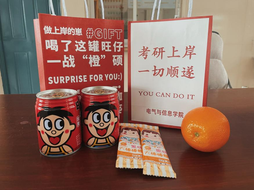 电气与信息学院为每一位考研学子精心准备了暖心大礼包——牛奶、棒棒糖、橙子,寓意着“一战成硕”“榜上有名”,同时,在宿舍一楼设置了应急药品和防疫备用包,供考研学子取用。