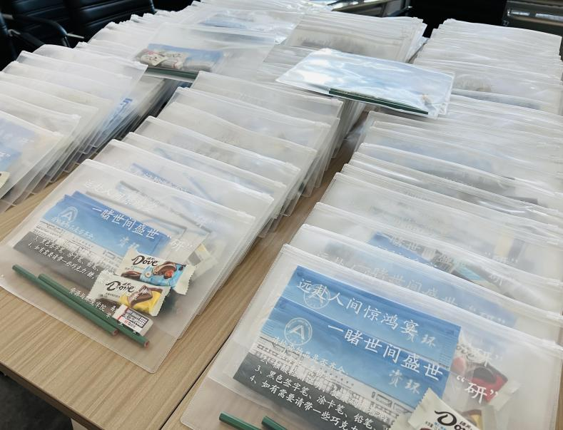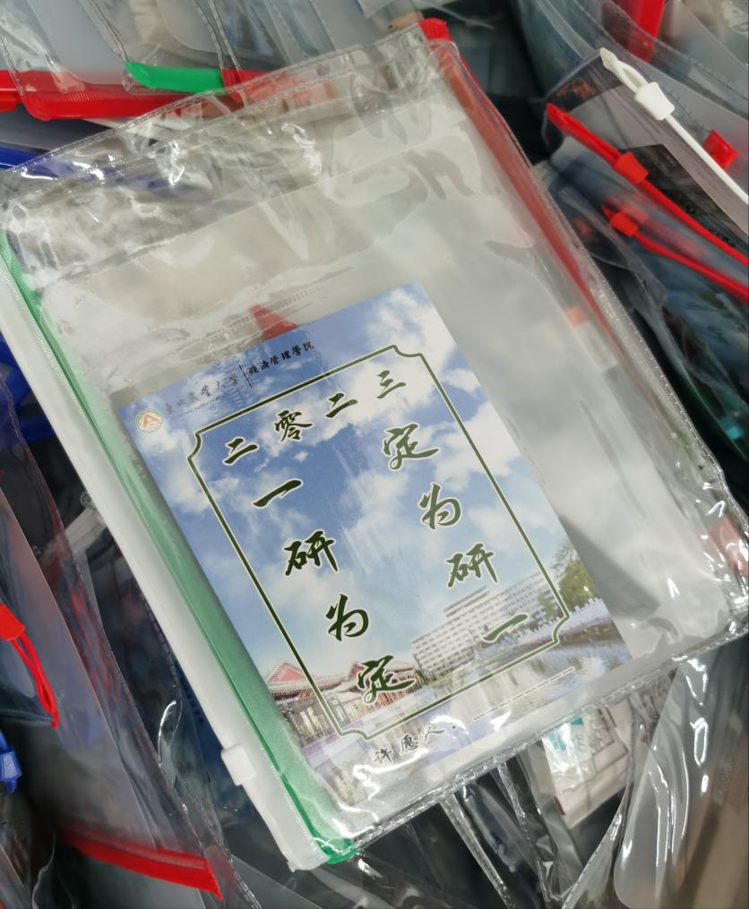 资源与环境学院为全院200余名考研学子发放了精心准备的文具收纳袋,包括口罩、巧克力、铅笔、橡皮等物资,封皮上“远赴人间惊鸿宴,一睹人间盛世‘研’”的祝福语满载着学院对考生们一战成硕的希冀。