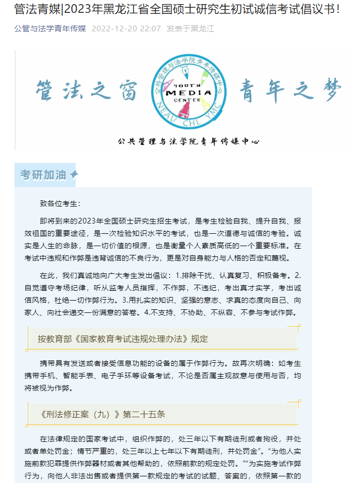 公共管理与法学院通过学院青媒推送诚信考试倡议书,并组织学生签署诚信考试承诺书,进一步强化诚信考试意识。