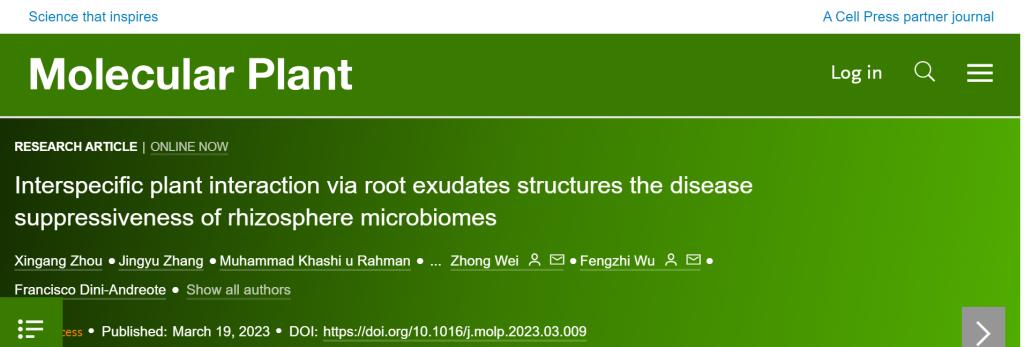3月19日,我校园艺园林学院教授吴凤芝、研究员周新刚等在解析植物多样性种植提高植物生产力机理方面取得重要进展,成果以《Interspecific plant interaction via root exudates structures the disease suppressiveness of rhizosphere microbiomes》为题发表于Cell子刊、植物科学领域国际权威期刊《Molecular Plant》(影响因子:21.949),我校为第一完成单位。(全文链接:https://www.cell.com/molecular-plant/fulltext/S1674-2052(23)00073-4)