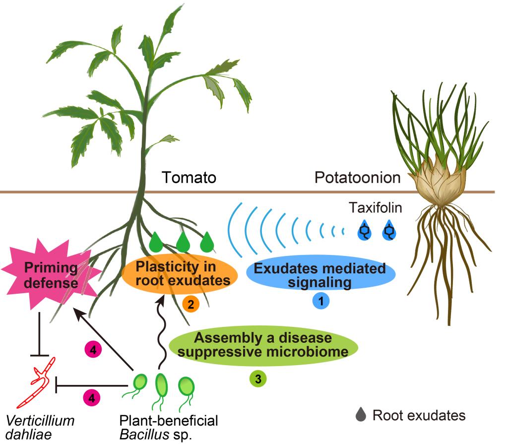 集约化农业极大地提高了农业生产效率,但不合理的集约化管理措施导致的土壤质量下降、土传病害加剧等连作障碍问题日益突出,制约了集约化农业可持续发展。多样性种植体系中,植物间可以通过种间互惠作用提高植物生产力。例如,间套作等多样性种植模式可以抑制作物病害、促进作物生长。吴凤芝课题组前期发现,分蘖洋葱(Allium cepavar.agrogatumDon.)伴生可以有效促进番茄(Solanum lycopersicum)等作物生长,并能抑制番茄黄萎病等土传病害发生。该研究以分蘖洋葱-番茄伴生体系为模式,解析了根系分泌物影响邻居植物根际微生物招募的机理。研究发现,番茄根系能感知分蘖洋葱根系分泌物中的信号物质(如二氢槲皮素);之后,番茄改变了自身根系分泌物组分,从而招募了有益微生物、塑造了抑病型根际微生物组;番茄根际招募的有益微生物能通过直接拮抗作用和诱导植物系统抗性抑制番茄黄萎病。该研究揭示了根系分泌物介导的植物种间互作通过诱导作物根系分泌物变化促进有益微生物根际定殖,从而抑制作物土传病害,进一步阐明了植物种间互作驱动抑病型根际微生物组构建的机制,并为植物根际微生物组精准调控提供了新思路。