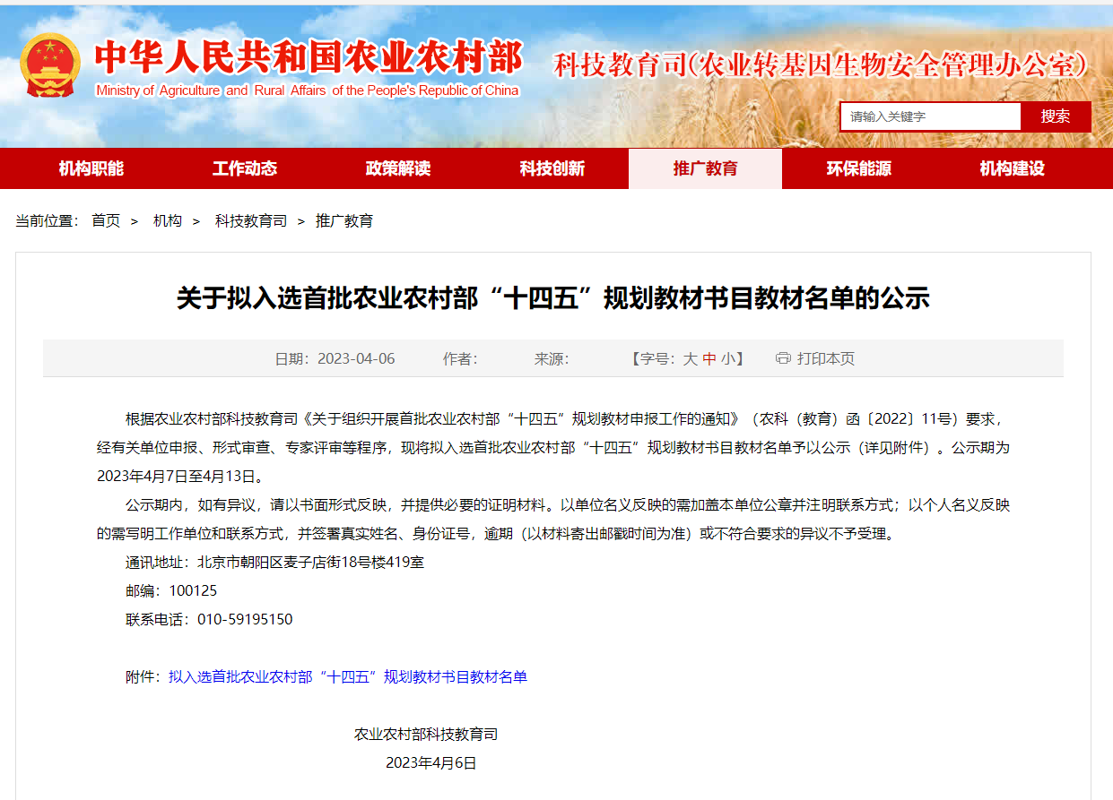 本次农业农村部“十四五”规划教材遴选是根据《农业农村部“十四五”规划教材建设指导方案》《农业农村部规划教材管理办法》和《关于组织开展首批农业农村部“十四五”规划教材申报工作的通知》文件精神,经各有关单位推荐,在农业农村部教材办公室教材建设专家委员会指导下进行,旨在深入贯彻落实习近平总书记关于教材工作的重要指示批示精神,进一步加强农业教育与农民培训教材建设,更好服务全面推进乡村振兴、加快农业农村现代化的人才教育培养工作。本次遴选首次将研究生教育教材列入其中。