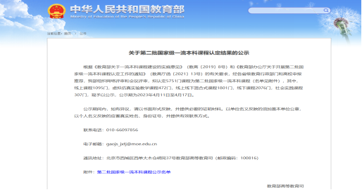4月11日,教育部发布了《关于第二批国家级一流本科课程认定结果的公示》,经各省级教育行政部门和高校申报推荐,教育部组织网络和会议评审,拟认定5751门课程为第二批国家级一流本科课程。我校推荐15门课程参加本次评选,其中12门课程入选国家级一流本科课程,包括线上一流课程1门,线上线下混合式一流课程7门,线下一流课程3门,社会实践一流课程1门,取得了历史性的新突破。