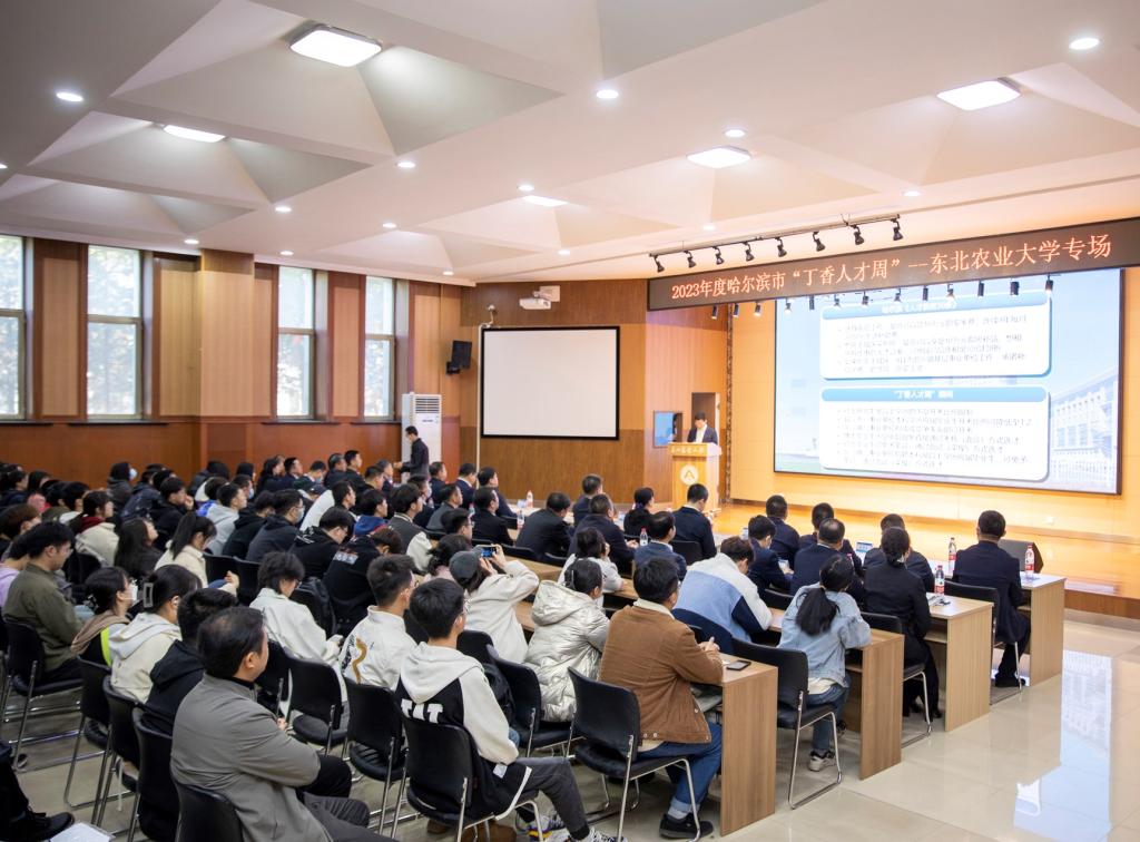 为落实省委省政府关于留住人才的决策部署,深入实施哈尔滨《人才新政30条》大学生就业创业支持政策,搭建市校共促毕业生就业合作平台,4月13日,2023年哈尔滨“丁香人才周”东北农业大学专场招聘活动在我校音乐厅举行。本次活动由哈尔滨市人才工作领导小组办公室、市农业农村局、呼兰区、巴彦县、延寿县与我校联合举办。哈尔滨市委组织部副部长郭世军、延寿县委常委、组织部部长李颖、呼兰区委常委、组织部部长任鹏来、宾县县委常委、组织部部长刘研以及哈尔滨市各有关部门、县市区及引才单位的负责同志,我校招生就业处处长宋跃芬、副处长吴立龙、部分学院毕业班辅导员及150余名毕业生参加现场推介会。