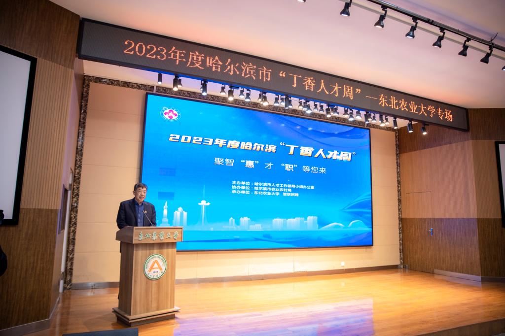 哈尔滨市农业农村局局长任延辉作主旨宣讲,他从哈尔滨城市的地域优势、城市特色、产业结构、《人才新政30条》等进行了全面的介绍和解读。他表示,哈尔滨市委、市政府将“三农”工作摆在重中之重的位置,将加大各类资源要素向农业农村倾斜力度,一体设计、一体推进农业现代化和农村现代化,期待有更多东农力量扎根冰城沃土,推动乡村振兴实现更大突破。