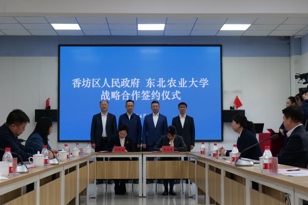 为深入贯彻落实党的二十大精神,进一步加强香坊区人民政府与东北农业大学政产学研用深入合作,推动东北农业大学国家“双一流”高校建设和香坊区经济社会高质量发展,4月15日,香坊区区委书记李亚飞、区长黄晓伟、常务副区长张磊、组织部部长杨铁岩、宣传部部长刘莉、副区长邹永刚及区人社局、教育局相关部门负责人一行16人,来学校签署区校战略合作及相关领域具体合作协议。校党委书记李长生、校长付强,副校长刘晓峰、刘竹青,学校相关处室和学院负责人参加签约仪式。会议由刘竹青主持。