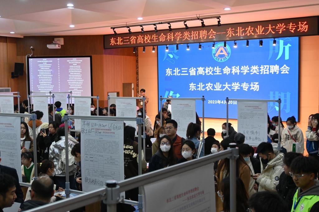 4月20日上午,东北三省高校生命科学类专场招聘会在东北农业大学音乐厅和智联招聘线下线上同步举行。本次招聘会由东北农业大学生命科学学院倡议发起,联合东北大学、辽宁大学、吉林大学、东北师范大学、哈尔滨工业大学、东北林业大学、哈尔滨师范大学等东北三省八所高校的生命学院共同举办,旨在落实党中央、国务院关于促进高校毕业生就业工作的一系列重大决策部署,抢抓春季学期促就业关键期,发挥东北三省高校之间的联动优势,整合单位资源、拓展就业市场、加强就业服务,为毕业生和用人单位搭建“精准对接”和“一站式”供需平台,切实推动2023届毕业生就业工作。学校党委副书记王泽方,招生就业处处长宋跃芬、副处长吴立龙,生命科学学院党委书记施喜军、副书记孙珠红、副院长李剑虹出席招聘会,吉林大学、哈尔滨工业大学、东北林业大学、哈尔滨师范大学等高校生命学院党委副书记、毕业班辅导员及毕业生来校参会。