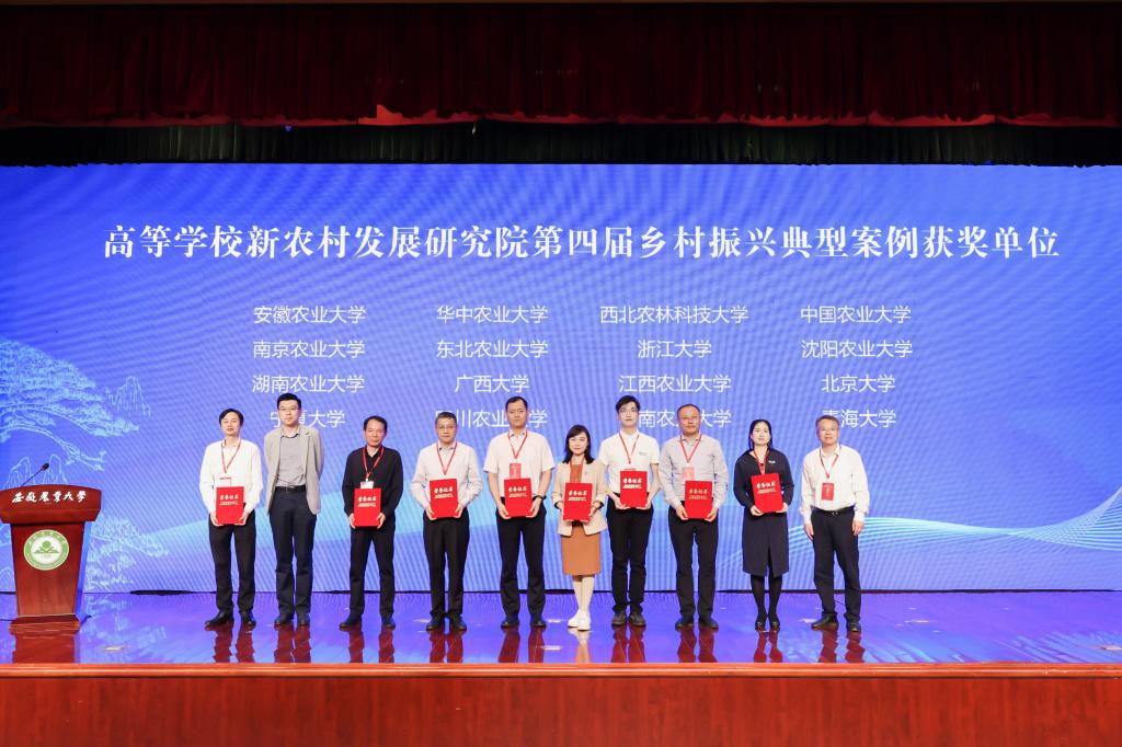 与会领导为获评高等学校新农村发展研究院协同创新战略联盟第四届乡村振兴的16个典型案例和17个优秀案例颁发荣誉证书。东北农业大学选送的《“牛”人领路 越走越富》被评为典型案例。