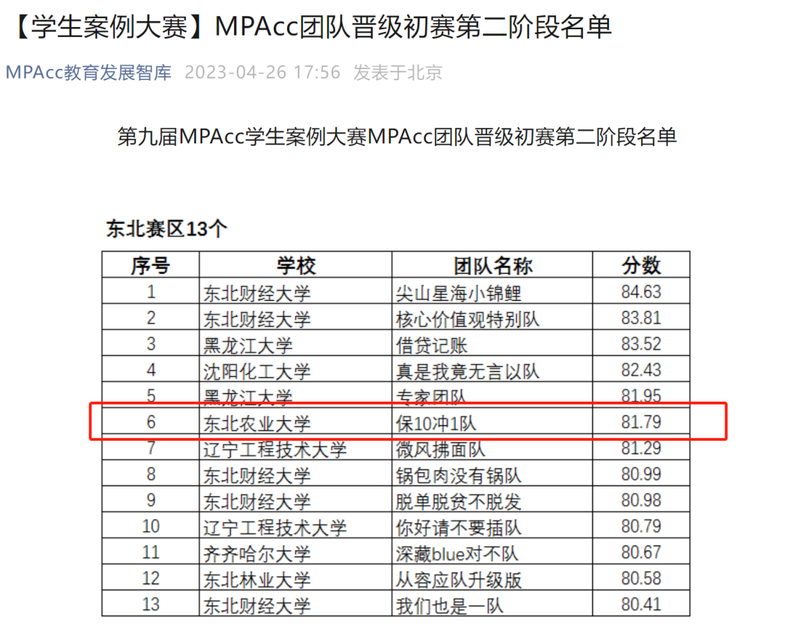 学校4支队伍获得东北赛区前30名的佳绩,由MPAcc主任、学校经济管理学院王积田副教授指导的“保10冲1”队伍,在全国400所高校3038支研究生队伍中脱颖而出,成功晋级百强并顺利入围下一赛程,这是学校MPAcc案例教学取得的又一阶段性进步。在学院领导的关切和指导教师的悉心指导下,学校各队伍间分工明确,从梳理结构,到共同修改调整内容格式,参赛同学在比赛过程中受益匪浅,并表示将在下一阶段继续发挥团结合作的精神,不断学习成长。