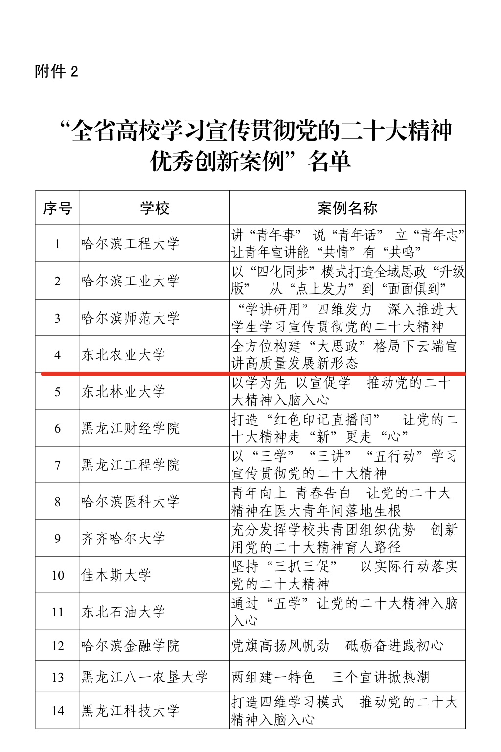 近日,省委教育工委公布了学习宣传贯彻党的二十大精神创新案例评选结果,东北农业大学按照《关于开展学习宣传贯彻党的二十大精神创新案例评选工作的通知》要求,积极组织申报,由宣传部申报的案例《“点”上发力 “线”上贯穿 “面”上融合 奏响学习宣传贯彻党的二十大精神最强音》获评“全省高校学习宣传贯彻党的二十大精神最佳创新案例”,马克思主义学院申报的案例《全方位构建“大思政”格局下云端宣讲高质量发展新形态》获评“全省高校学习宣传贯彻党的二十大精神优秀创新案例”。