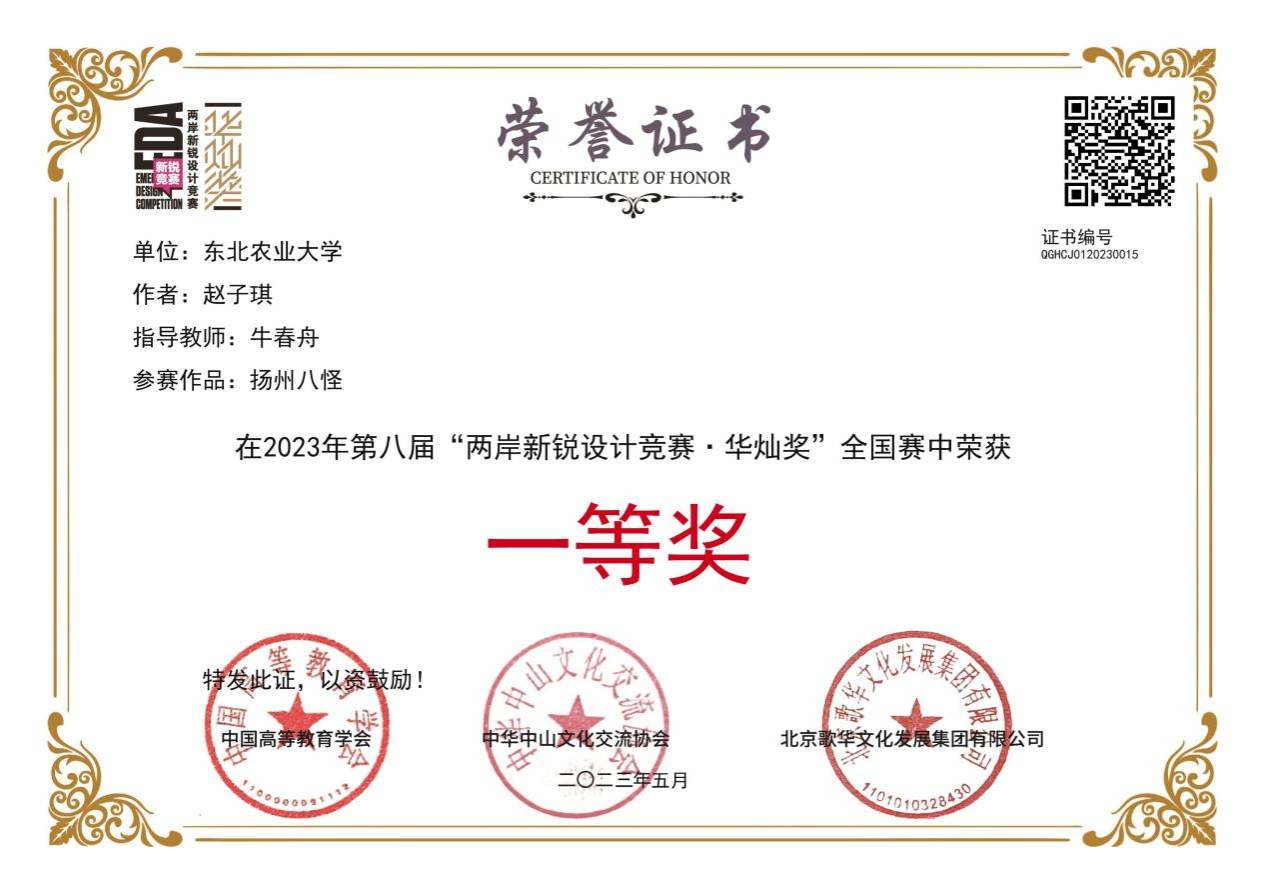 由艺术学院2021级艺术设计专业硕士研究生赵子琪同学创作的设计作品《扬州八怪》获得全国总决赛一等奖(黑龙江省唯一一等奖获得者),该作品系东北农业大学研究生课程思政教学案例《数字媒体综合应用研究》建设的阶段成果。同时,指导教师牛春舟获得优秀指导教师奖。