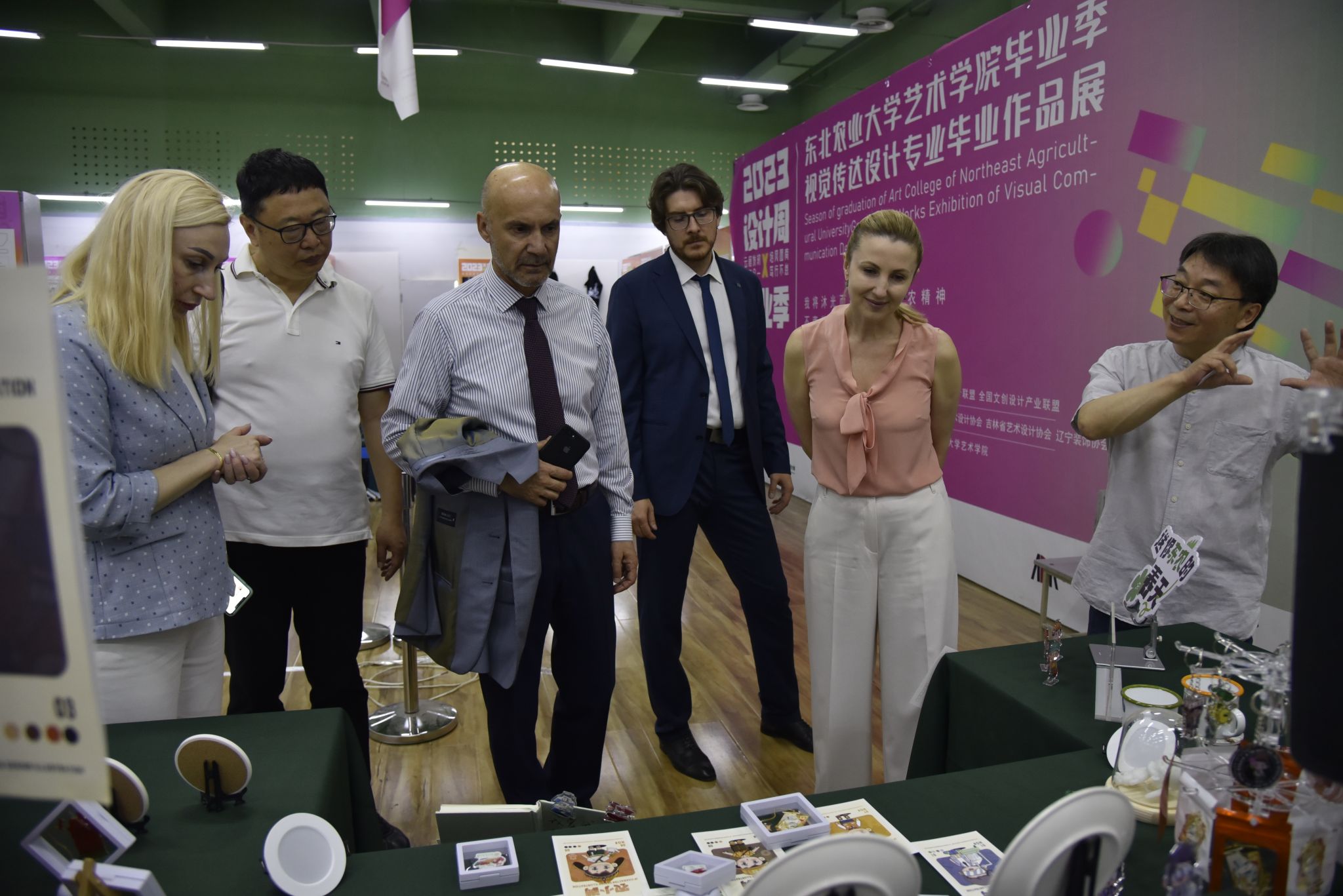 在艺术学院走访时,代表团回顾了两校在今年5月进行“艺术学院中俄交流会系列活动”的来访情况。在艺术学院党委书记于向国,副院长张沛巍的陪同下参观了“艺术学院2023届艺术设计学环境设计系毕业设计作品展”和“艺术学院毕业季视觉传达设计专业毕业作品展”。双方重点探讨了在陶艺创作和文创产业发展方面的合作意向。
