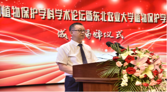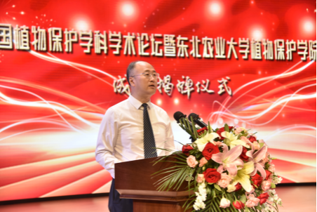 会上,付强校长致欢迎词。他指出,黑龙江作为农业大省,是国家商品粮的重要产区,同时也是国家绿色有机农产品重要生产基地,绿色食品产量一直稳居全国第一,被国家绿色食品发展中心等有关部门誉为“行业龙头”。当好维护国家粮食安全的“压舱石”,争当农业现代化建设排头兵,是习近平总书记对龙江的殷切期望。我们在这里举办“全国植物保护学科学术论坛暨东北农业大学植物保护学院揭牌仪式”,既是深入贯彻落实党的二十大科教兴国、人才强国、创新驱动发展“三大战略”的现实举措,也是服务国家乡村振兴战略的实际行动。植物保护学院的成立,也必将更好发挥东北农业大学教育资源优势,培养更多知农爱农新型人才,推动龙江绿色低碳发展,助力龙江从农业大省向农业强省迈进。本次论坛必将为学校师生提供一次难得的学术盛宴和思想盛宴,希望在座各位师生,珍惜学习机会,在论坛中学有所思、学有所悟,进一步厚植爱农情怀、提振强农信心、增强助农本领,坚定不移为助力龙江全面振兴全方位振兴、谱写社会主义现代化建设龙江新篇章作出新的更大贡献。