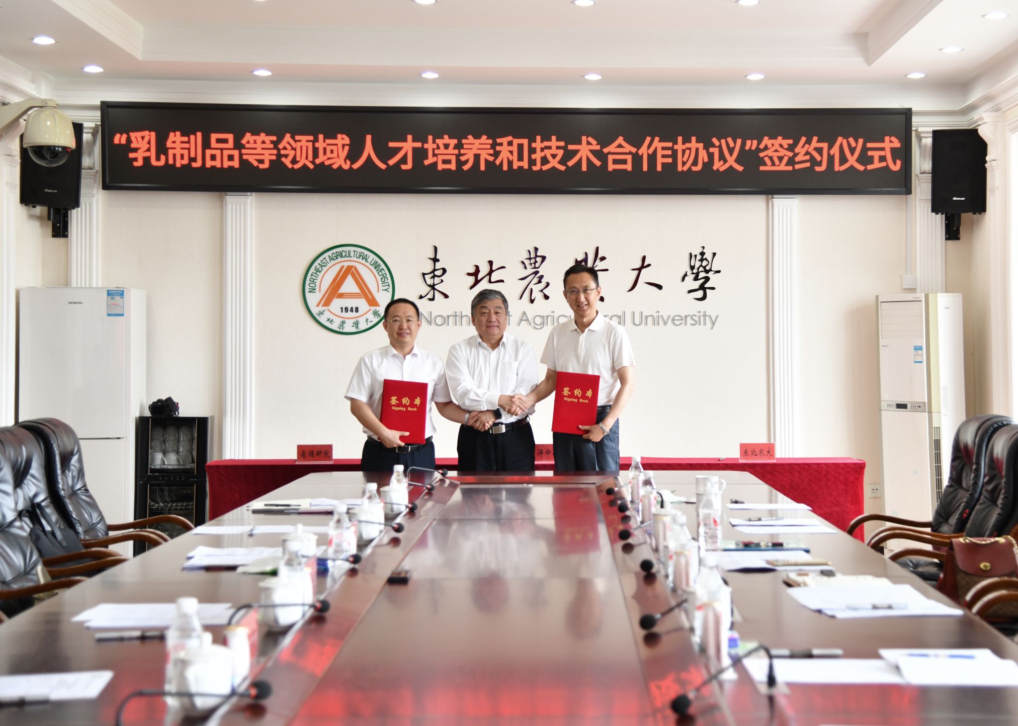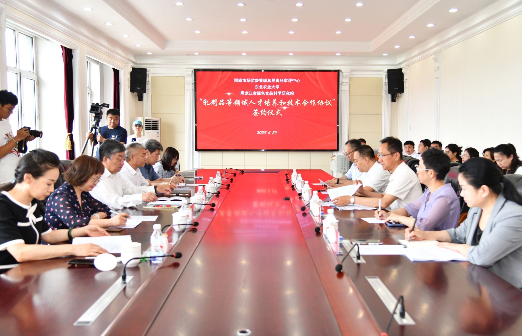 6月29日上午,国家市场监督管理总局审评中心、东北农业大学、黑龙江省绿色食品科学研究院“乳制品等领域人才培养和技术合作协议”签约仪式在主楼604会议室举行。国家市场监督管理总局食品审评中心党委书记、主任高峰,婴配审评部主任龙继红、食品检查部主任孙全胜、婴配审评部翟志芳,黑龙江省市场监督管理局食品安全总监于孟超、特食处处长麻志红,我校党委书记李长生,省绿研院党委书记、院长高放,食品学院党委书记潘俊波、院长姜毓君,省绿研院食品标准与检测中心执行主任杨文敏及相关人员参加了签约仪式。签约仪式由高放主持。