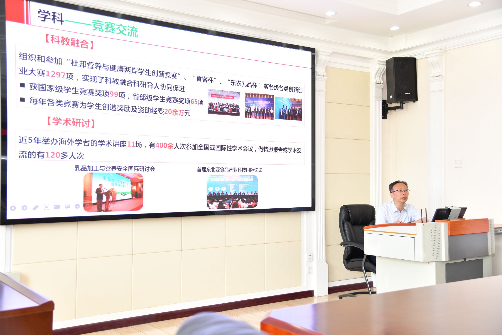 姜毓君从平台建设、人才培养、竞赛交流、虚仿培训、研究团队、科研项目等方面汇报了食品学科发展情况,重点介绍了食品学院多年来支持国家市场监督管理总局食品审评中心工作在“婴配粉法规制修订、食品安全国家标准制修订及食品生产企业技术规范制修订”等方面的研究工作和重要成果。