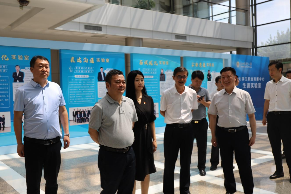 座谈会结束后,方伟参观了我校大学生职业发展中心八个生涯实验室。中心由我校自主研发和建设,设有职业测评、职业认知、团队建设、群体选拔、表达沟通、简历优化、面试优化、公职考录八个生涯实验室,通过全程化、沉浸式的实践、体验、互动等方式,强化学生对生涯的思考、规划与行动,不断提高学生生涯适应力和就业综合竞争力。目前,大学生职业发展中心实训课程和体验活动已向全校学子开放。方伟一行对中心的设计理念、教学活动安排、实践训练环节等方面给予了充分肯定。