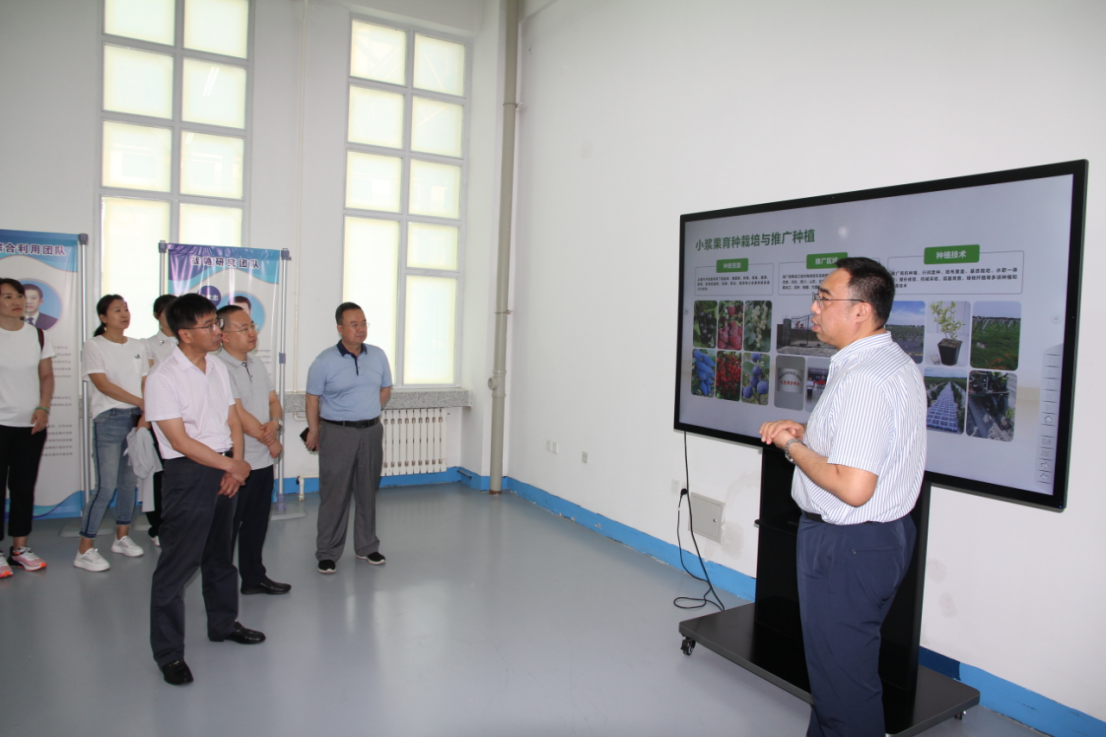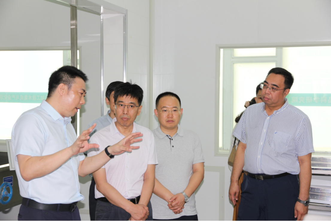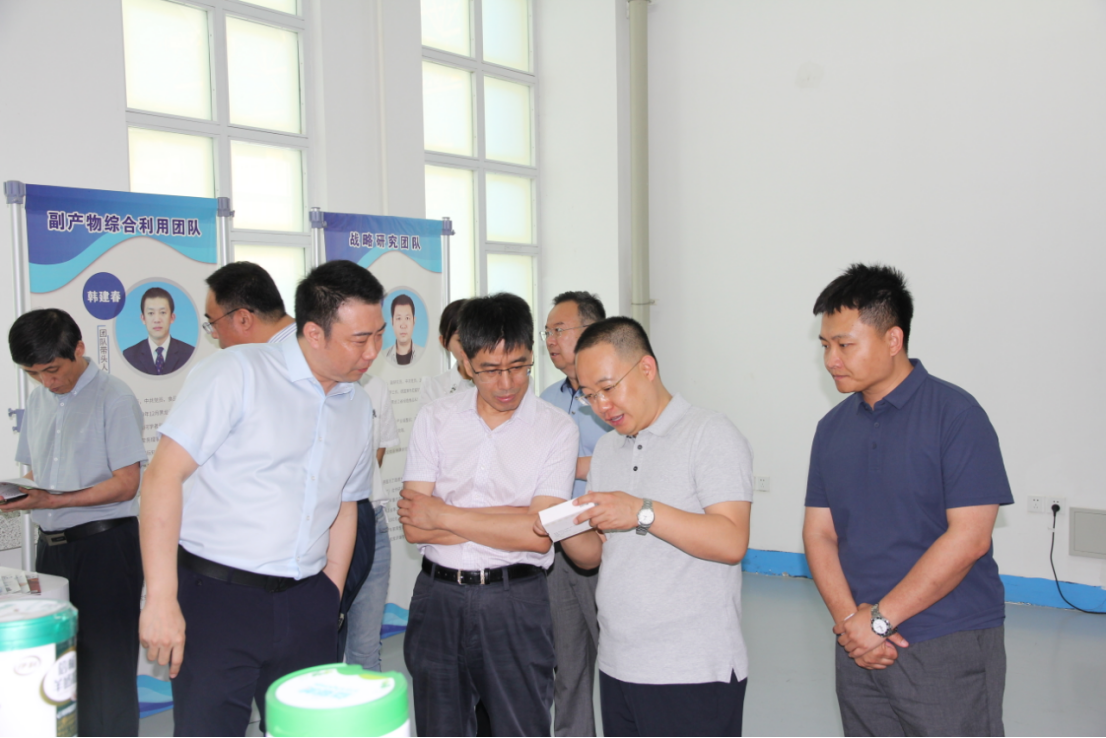 在绿研院一楼中试产品展厅,党委副书记高汉峰详细汇报了绿研院“乳、豆、果、副、肥+战略规划、检验检测”5+2技术创新研发领域在技术服务、成果转化、信息共享、人才培养等方面取得的业绩、关键技术储备和企业合作、产品成果。