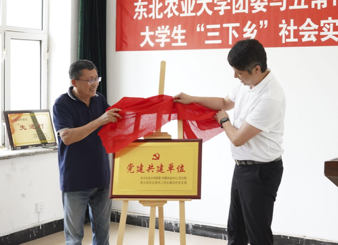 二河乡新庄村党支部书记刘清泉对东农师生的到来表示热烈欢迎,并对新庄村基本情况进行了简要介绍。随后,校团委(创新创业中心)党支部与二河乡新庄村党支部举行了“党建共建单位”揭牌仪式。