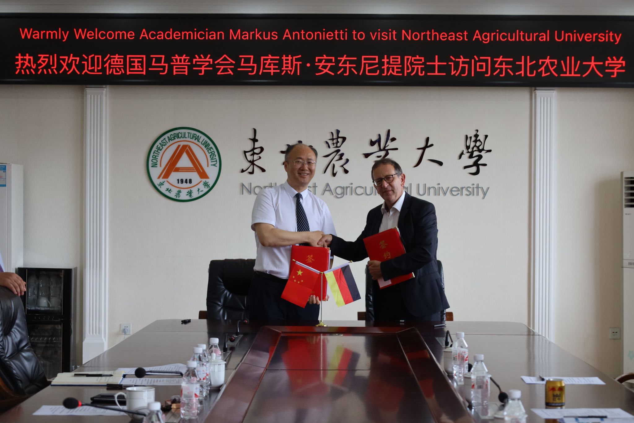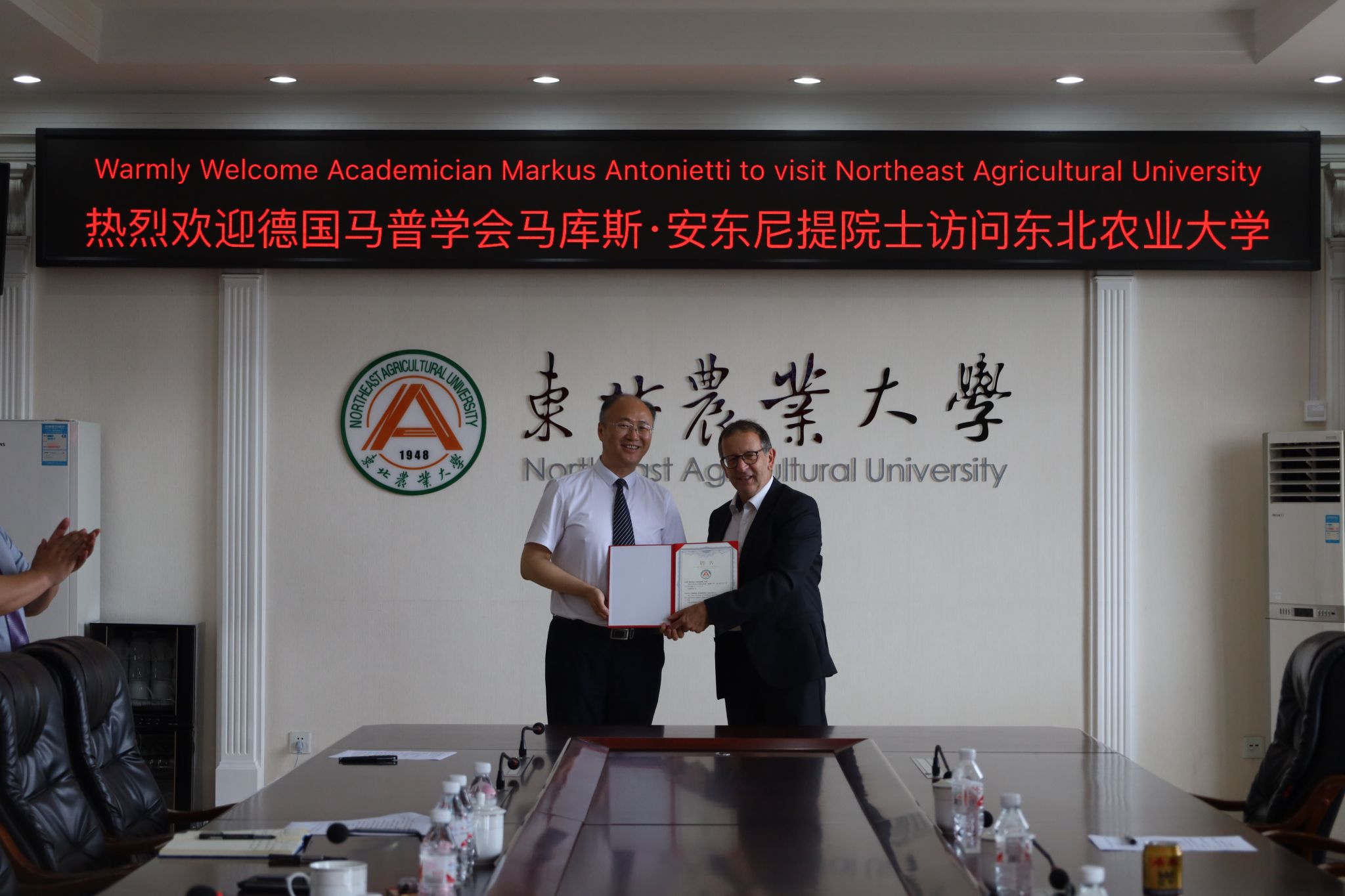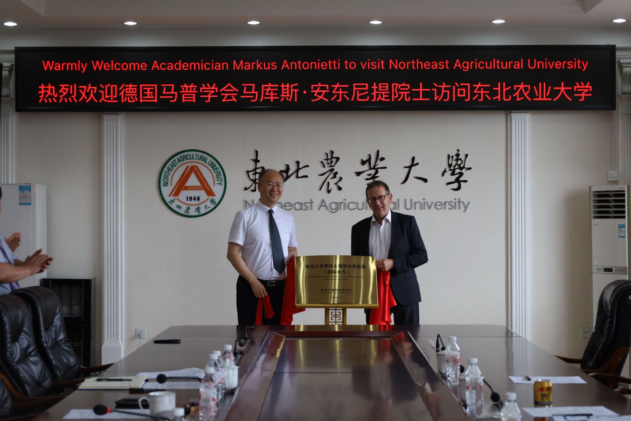 7月23日上午,德国马普学会副会长,欧洲科学院院士马库斯·安东尼提教授来访我校,与校长付强教授在主楼604会议室进行会谈。会谈由国际交流合作处处长卢铁光主持,科学技术处处长寇胜利,水利与土木工程学院党委书记张索坤、院长刘东、教授杨帆,国际交流合作处副处长孙晔和其他15名“黑龙江省智能土壤联合实验室”成员师生一同参会。