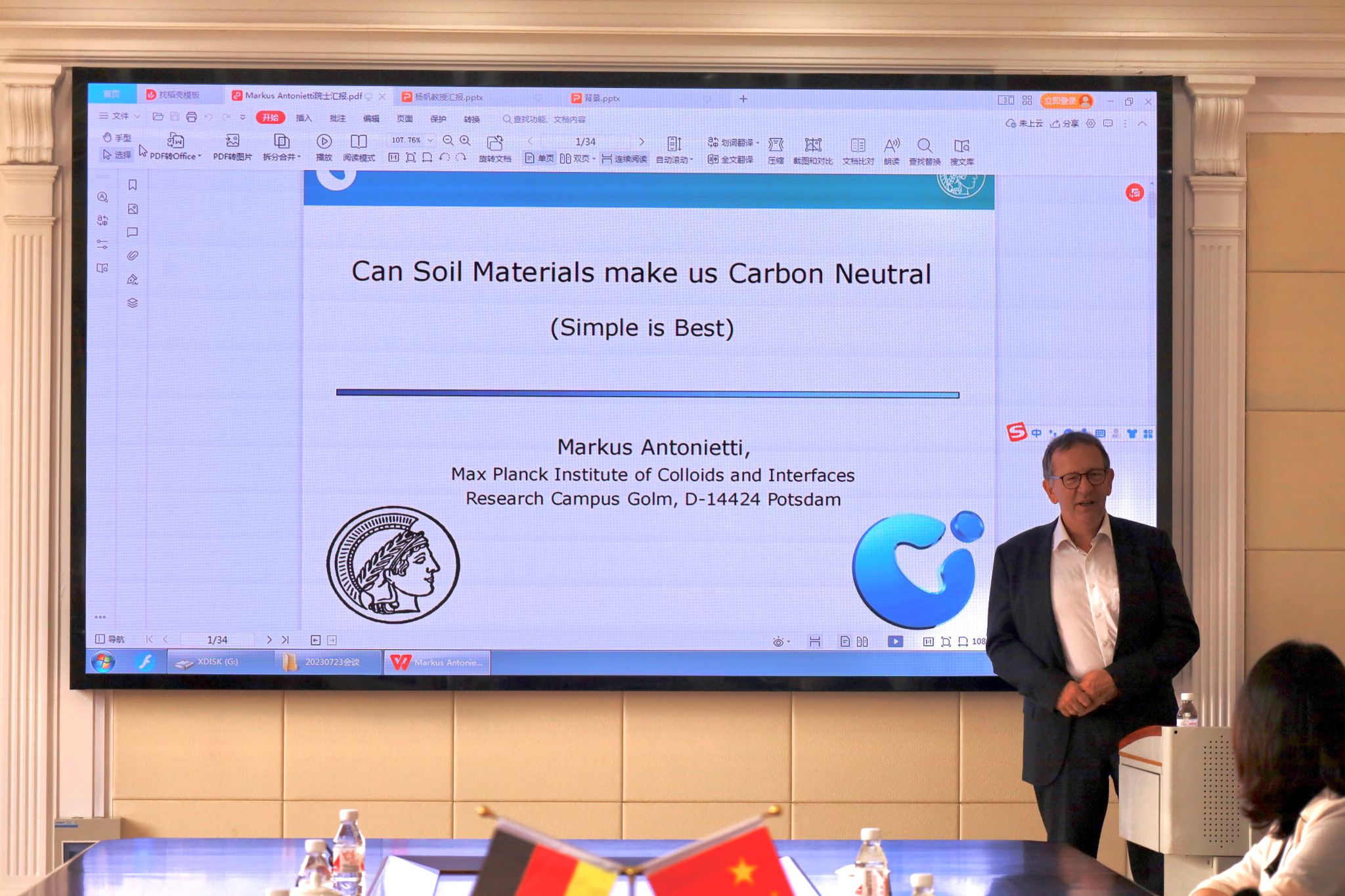 马库斯·安东尼提院士作了题为《土壤物质能否帮助我们实现碳中和》的学术讲座,分享了土壤肥力下降成为全球范围共性问题的现状,提出了“水热腐殖化”中聚合物对农业和土壤修复的重要作用,介绍了领域创造力和学术限制问题,并强调了核心学科以外的分支学科助力分析碳中和问题的作用。