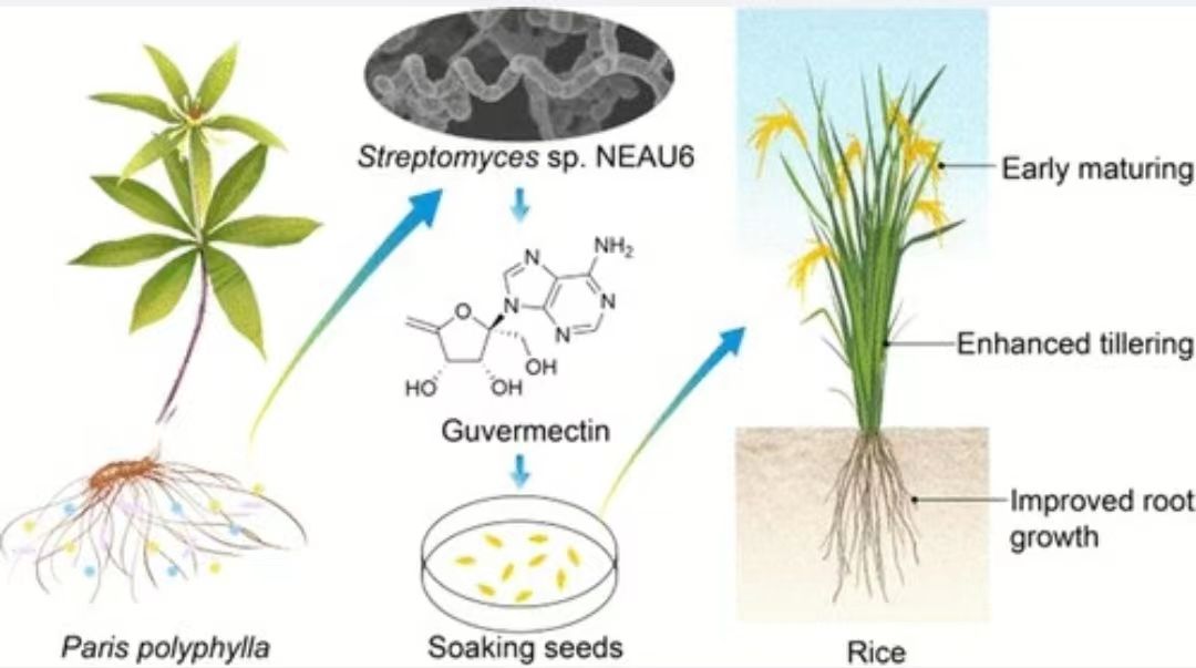 植物生长调节剂(PGRs)在提高作物产量和质量方面发挥着至关重要的作用。文章中报道了一种新的植物生长调节剂guvermectin(GV),它可以从植物生长促进根瘤菌中分离出来,能够促进水稻根系和叶柄的生长、分蘖和早熟。一项为期四年、涉及28个水稻品种的田间试验表明,用GV进行浸种处理可使产量提高6.2%至19.6%,优于其他PGRs。(原文链接:https://axial.acs.org/agriculture-and-food-chemistry/journal-of-agricultural-and-food-chemistry-research-article-of-the-year-award-2023)