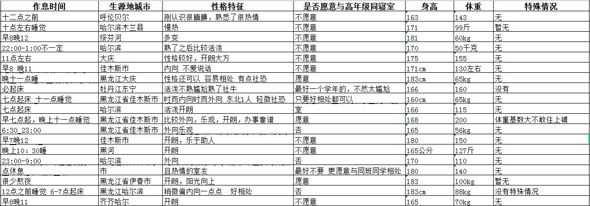 其中,园艺园林学院在个性化意愿征集的过程中设计了“对大学生活的期待”以及“对四年后的自己说一句话”等题目,让新生感受到来自学院的“仪式感”;工程学院、水利与土木工程学院通过“新生入学‘茫’,学长来帮忙”、学生骨干一对一对接等活动充分发挥朋辈作用,及时解决新生困难,对新生身高、体重、生活作息规律等进行详细记录,为分寝工作提供参考;农学院、经济管理学院利用线上线下“双轨制”工作模式,提前与学生公寓管理员建立联系,并针对学生自身性格、爱好特长、集体生活经历以及对室友的期待等方面情况进行个性化分寝,使寝室分配更加科学合理;资源与环境学院、公共管理与法学院和艺术学院则主要对新生性格、学业发展规划等信息进行归纳分类,综合学生学业发展需求、性格吻合度等特点为新生“量身打造”个性化宿舍;动物科学技术学院、动物医学学院和生命科学学院在分配前期实地考察宿舍楼情况,主要针对新生躯体健康、卫生习惯、作息规律、适应能力等信息做进一步掌握,综合考虑将体型特殊及特殊健康情况学生安排至下铺,使寝室分配更加科学化、合理化、个性化;食品学院、文理学院通过今日校园APP平台发布个性化分寝信息收集,并因当前个别地区受灾严重,同步设立“临时困难补助选项”,对特殊异常情况逐一通过电话沟通,力求传递东农情怀、人文关怀;植物保护学院、电气与信息学院和国际文化教育学院则重点将具有相同兴趣爱好的新生进行“合并同类项”,助于快速建立和谐的寝室文化,发挥寝室阵地的良性促进作用。
