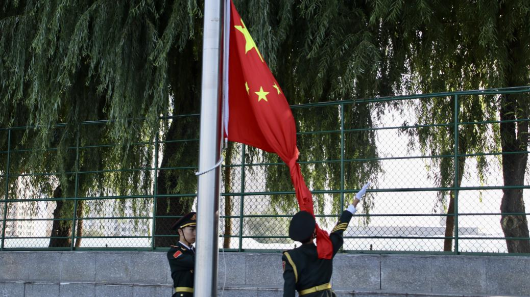 伴随着雄壮的《义勇军进行曲》,全体师生面向国旗肃立致礼,高唱国歌,鲜艳的五星红旗冉冉升起。