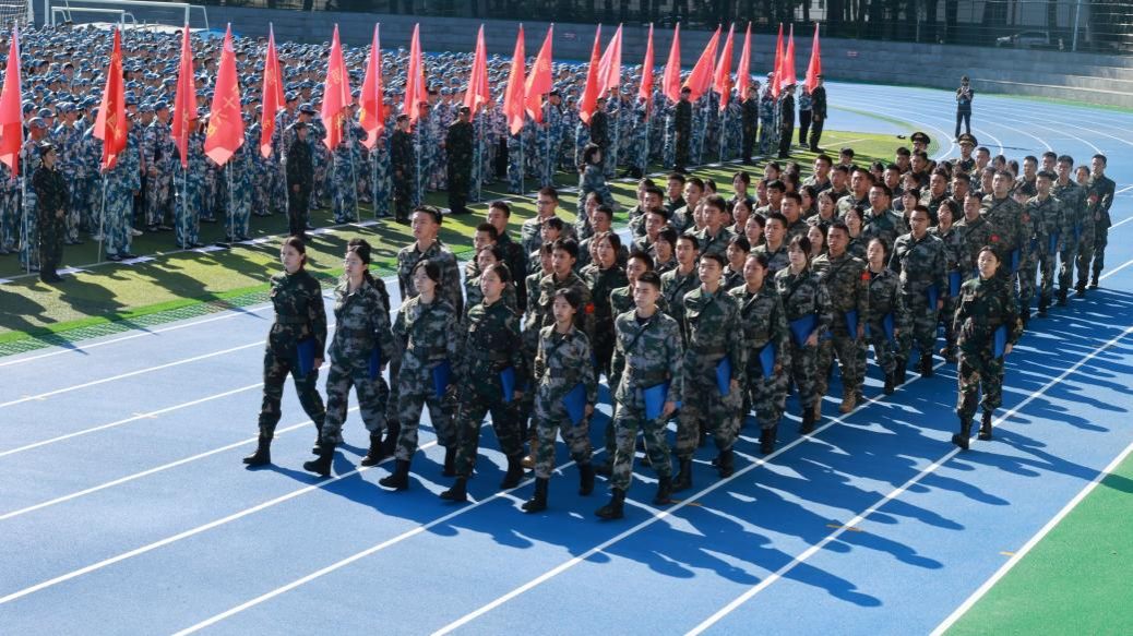来自我校退役大学生士兵队、国旗护卫队和军事协会的106名学生军训教官身着戎装,整齐列队,在响亮的口令和现场师生热烈掌声中,迈着矫健的步伐并入73个连队。