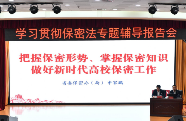 为深入贯彻落实习近平总书记关于保密工作的重要讲话和重要指示精神,进一步做好新修订的《中华人民共和国保守国家秘密法》宣传贯彻工作,持续提升全校上下做好保密工作的使命感、责任感,4月17日上午,我校邀请省委保密办(省国家保密局)专家来校作专题辅导报告。相关校领导、校保密委员会成员单位全体正、副处级干部,各职能部门、各学院主要负责同志,各学院分管科研工作副院长、科研秘书及部分师生代表参加会议。报告会由校党委副书记贺景平主持。