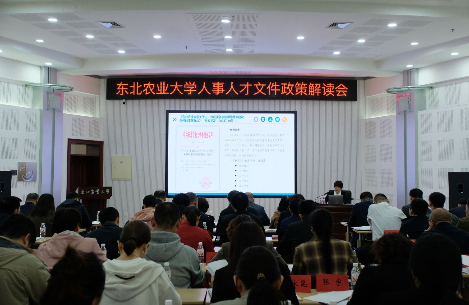 人事处副处长黄嘉鑫对《东北农业大学师德考核实施办法》《东北农业大学关于进一步压实学院师德师风建设责任的实施办法》《东北农业大学2024年师德教育培训工作实施方案》等文件和学校优秀人才引进流程及优秀人才职称评聘相关政策调整情况进行了解读。近年来,教育部印发多项关于高校教师思想政治和师德师风建设体制机制工作指导意见,黑龙江省教育厅2023年12月印发《黑龙江省高校教师师德师风考核评价指导意见(试行)》,为贯彻落实教育部和省教育厅相关文件要求,学校对原有师德考核实施办法进行修改,将师德年度考核结果分为优秀、合格、基本合格和不合格四个考核档次,师德年度考核不合格档次教职工在职务(职称)评审、岗位聘用、评优奖励等方面实行一票否决。学校将师德教育培训与“学习培训三年行动”相结合,开展师德学习培训、先进事迹宣传教育、负面案例警示教育等三个层面13项具体活动,将师德教育培训工作贯穿工作始终。近年来,学校陆续出台实施系列人才政策,引进人才数量和质量得到持续提升,为保持学校引人进人政策上的竞争优势,加大对引进人才的考评力度,学校立足实际情况,对公开招聘引进优秀人才的工作流程和政策进行了调整,并在2024年公开招聘人才引进工作中施行。