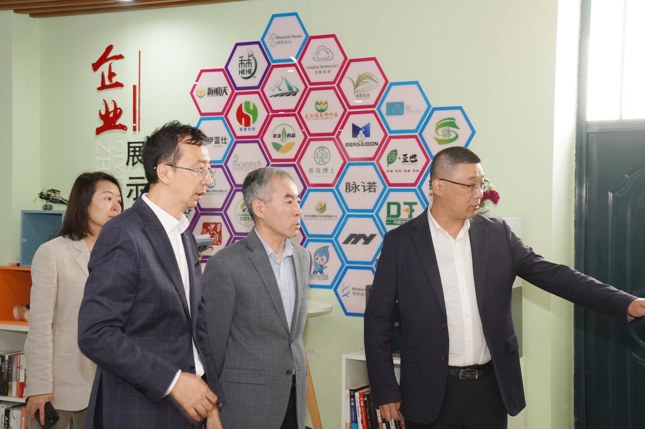在大学科技园科技成果转化陈列展厅,社会合作与成果转化中心副主任宋珲介绍了学校在生物种业、生物肥料、循环农业、农业装备、食品加工、医药研发等领域科技成果转化相关情况。