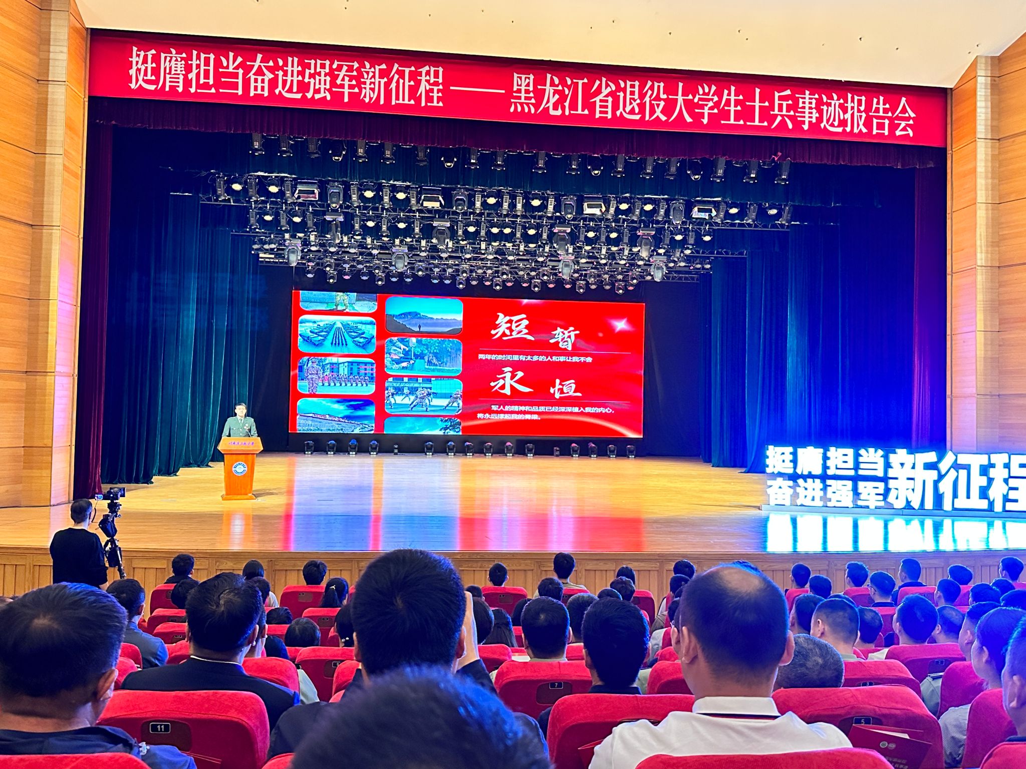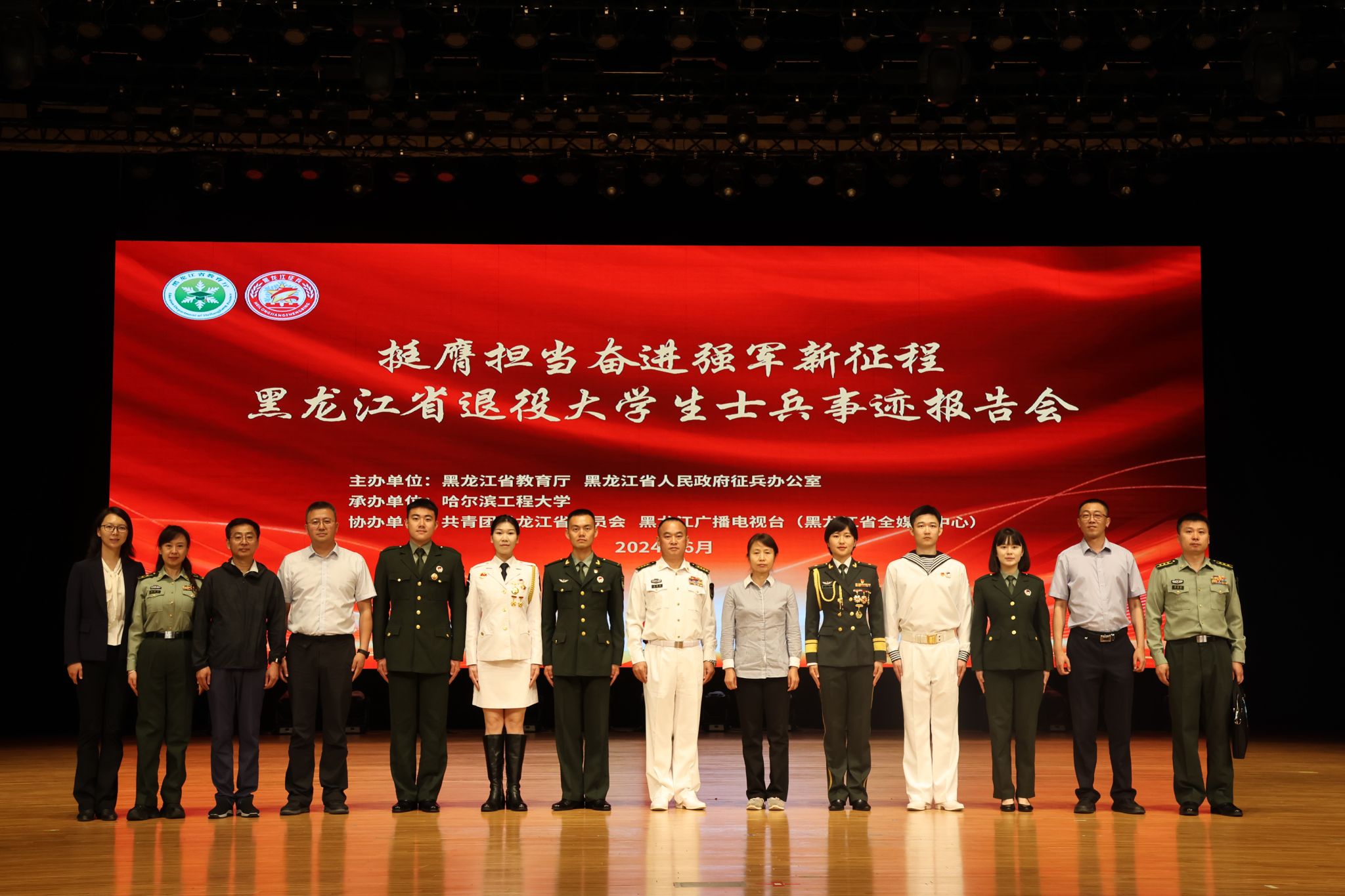 为深入学习贯彻习近平强军思想和习近平总书记关于加强和改进兵役工作的重要指示精神,进一步发挥我省入伍大学生士兵典型引领示范作用,弘扬青年学子投笔从戎、建功强军事业的新时代精神风貌,激发广大青年学子关心国防、献身国防,6月13日上午,“挺膺担当奋进强军新征程——黑龙江省退役大学生先进事迹报告会”在哈尔滨工程大学隆重召开。
