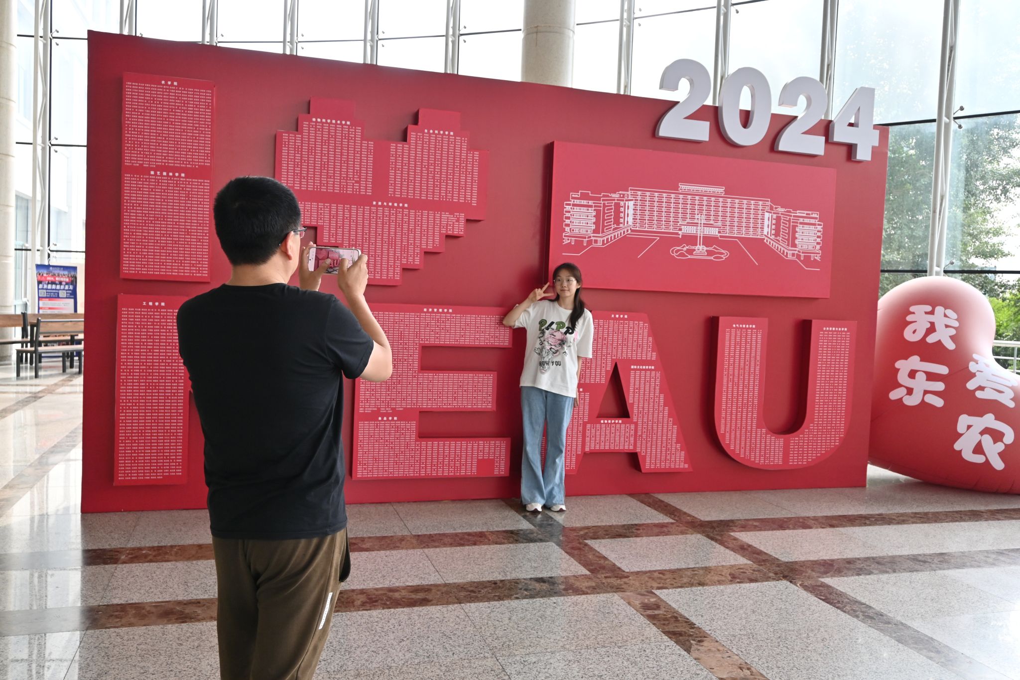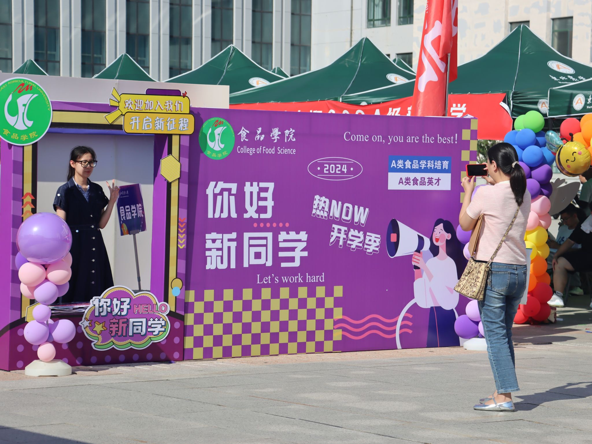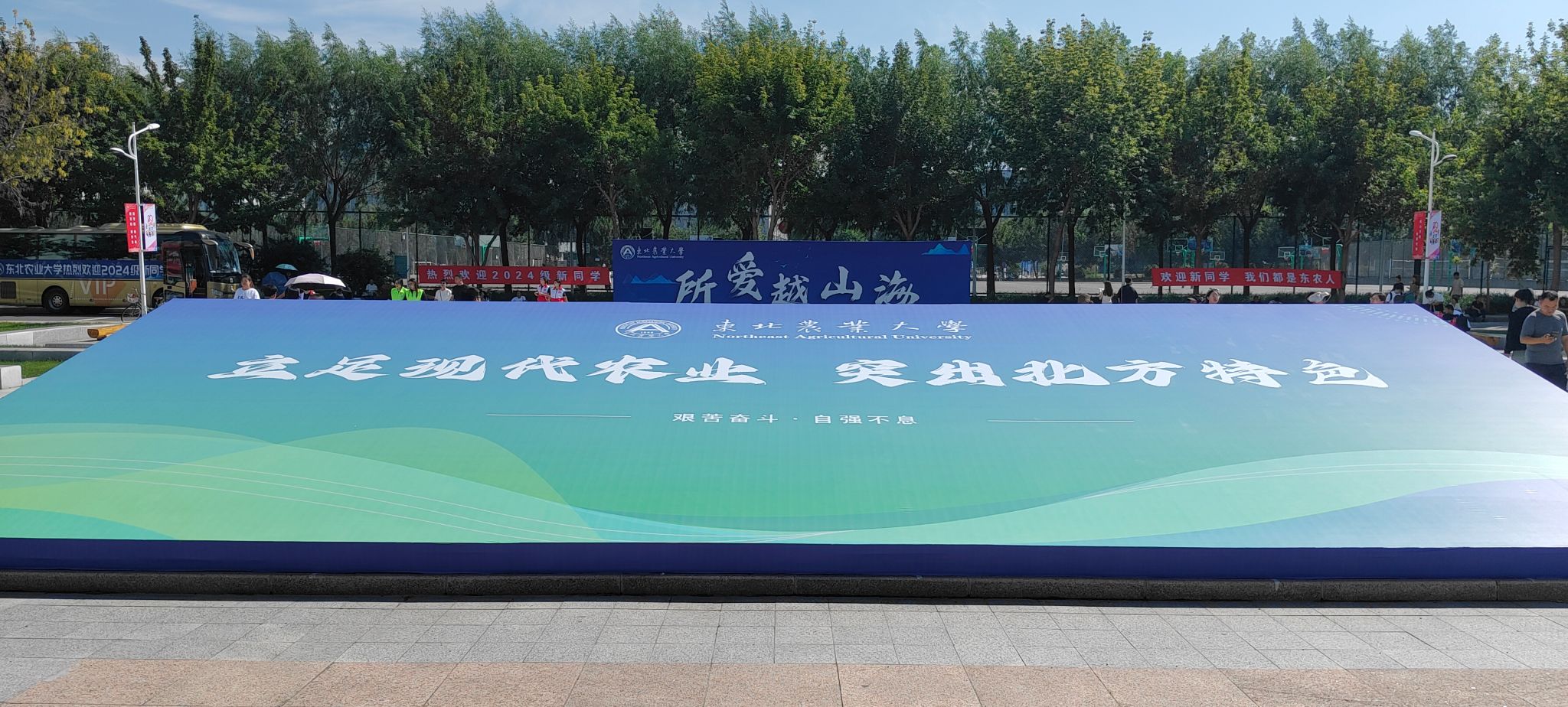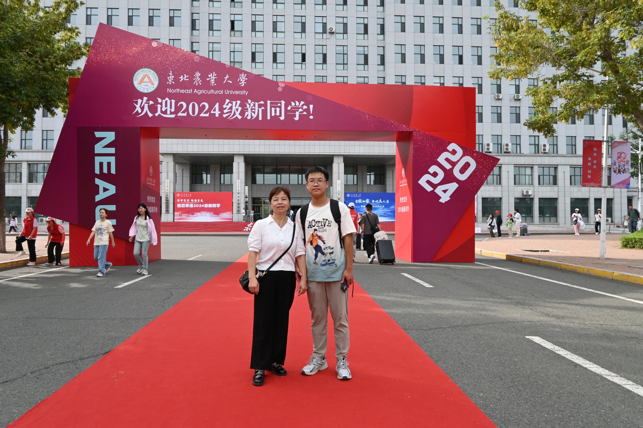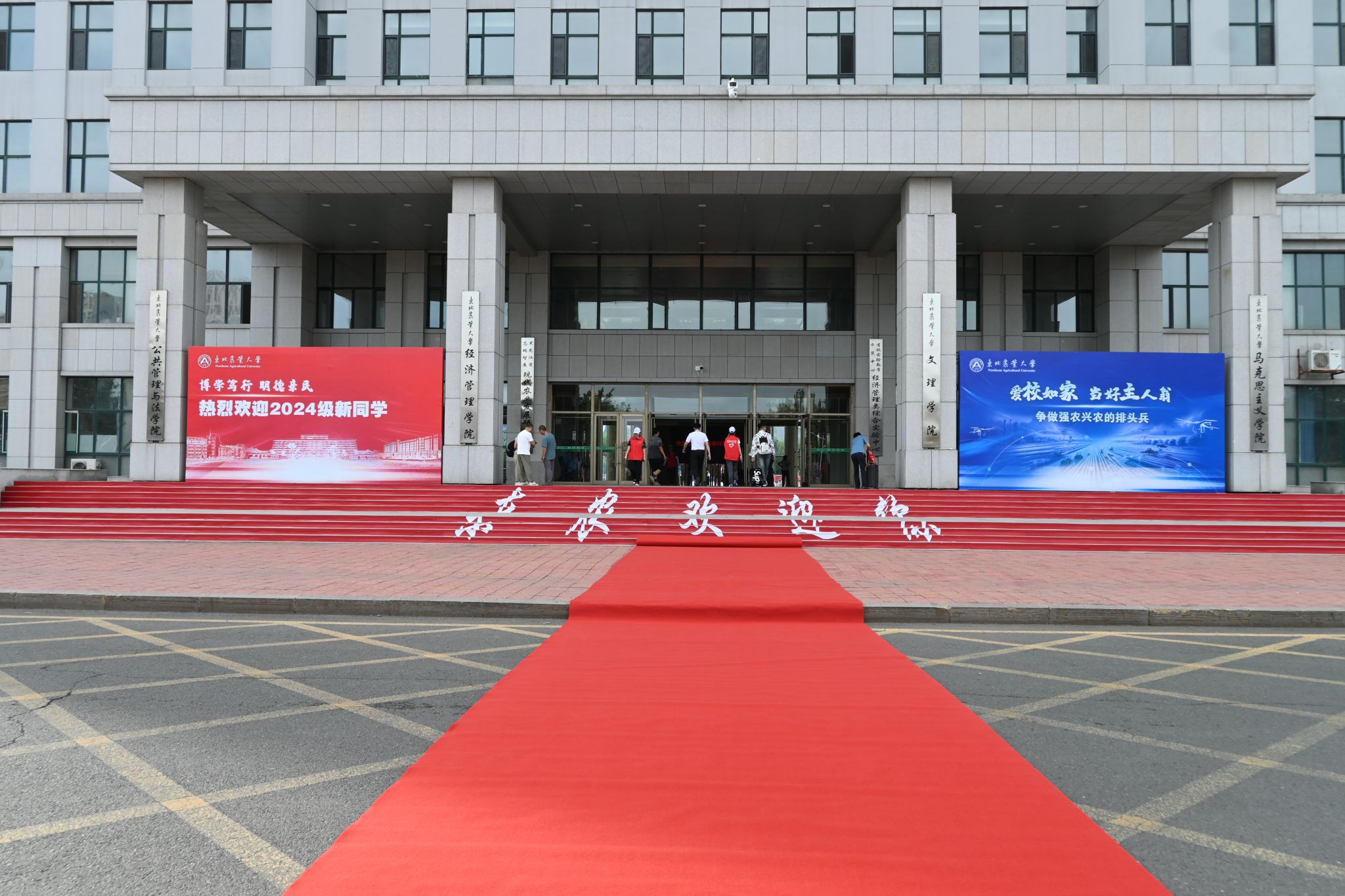 今年的迎新现场设置在学校成栋楼南广场。从学校长江路北门至成栋楼,铺设了一地红毯,新生迈上红毯,步行至报到入口处,寓意着迈向了人生的新阶段。成栋楼大厅左侧,是学校为全体新生制作的专属姓名墙,将每一名2024级萌新的名字镌刻在“I Love NEAU”上,新生们可以在这里圈出自己的名字,打卡拍照。成栋楼大厅右侧,是“欢迎新同学”的标语,激励新生们厚植爱农情怀、练就兴农本领,争当“立大志、明大德、成大才、担大任”的时代新人。来到成栋楼南广场,“立足现代农业 突出北方特色”彰显了东农人为新时代新征程龙江现代化建设贡献智慧和力量的决心。