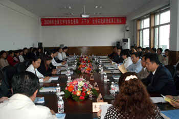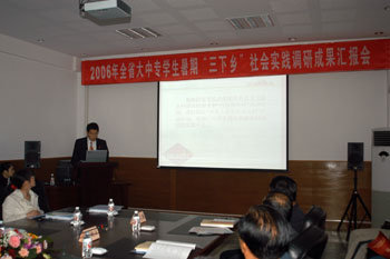 9月29日上午,2006年全省大中专学生暑期“三下乡”社会实践调研成果汇报会在我校召开。省委副秘书长李显刚、团省委书记高环、团省委副书记李豪岩、省教育厅副厅长康保林、省委政策研究室副主任戴中泉、省委宣传部宣教处处长袁克敏、省新农村建设办公室指导组组长李文德、省教育厅学生处副处长高铁春、省精神文明办秘书处副处长牟喜颖,我校党委书记刘世常、校长李庆章、纪委书记李潮江、校长助理董广芝以及黑龙江省在哈高校团委书记、大学生实践服务团代表等出席了汇报会。团省委副书记李豪岩主持会议。