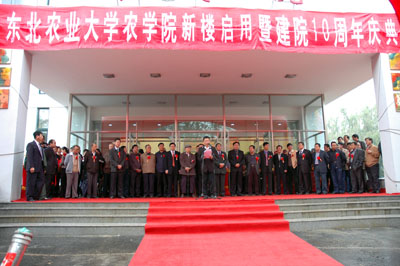 黑龙江省科技厅副厅长潘忠、黑龙江省农委副主任李文华等,校领导刘世常、李庆章、秦智伟、张长利、刘荣、李潮江、刘德深等,原省领导王金陵等,离退休校领导高尔瞻、史伯鸿、刘文周、候中田、曲显湖、李英等,农学院党委书记王成贵、院长魏湜等与前来祝贺的各市、县企事业单位人士,农学院老校友、师生济济一堂,共同参加了农学院建院10周年庆典活动。