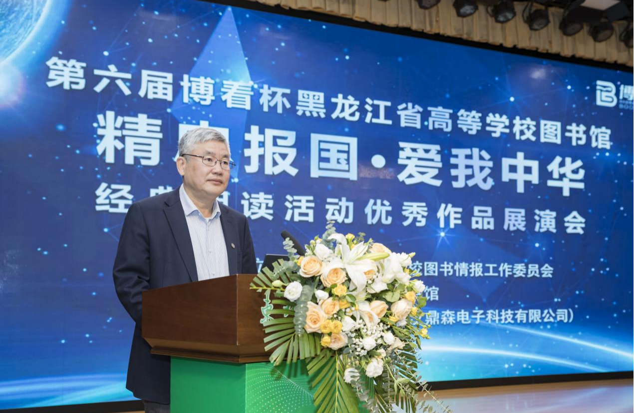省高校图工委秘书长、哈尔滨工业大学图书馆馆长刘宏伟在开幕式致辞。刘宏伟对本次经典朗读活动的开展给与充分肯定,指出朗读是对文字的再创作,朗读好书、好文章、好片段能再现文章的诗性美,让文字在声情并茂中融为思想、融入灵魂、凝聚精神力量。强调要在今后继续着力加强图书馆的文化建设,积极投入校园文化建设及全社会的文化建设中,为中华民族优秀传统文化的传承和创新作出贡献。