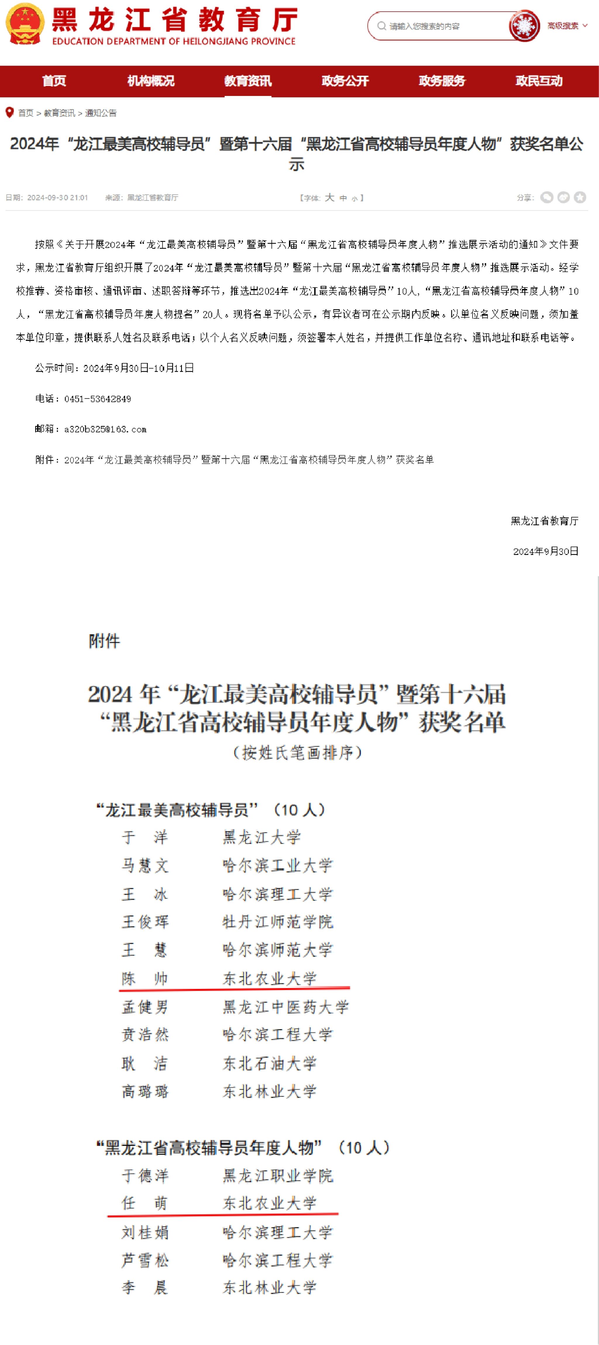 近日,由省委教育工委会同省委宣传部、省教科文卫体工会共同组织开展的2024年“龙江最美高校辅导员”暨第十六届“黑龙江省高校辅导员年度人物”推选展示活动圆满落下帷幕,共推选出2024年“龙江最美高校辅导员”10人,“黑龙江省高校辅导员年度人物”10人。经资格审核、通讯评审、述职答辩等环节的激烈角逐,东北农业大学资源与环境学院辅导员陈帅获得2024年“龙江最美高校辅导员”荣誉称号,食品学院辅导员任萌获得“黑龙江省高校辅导员年度人物”荣誉称号。