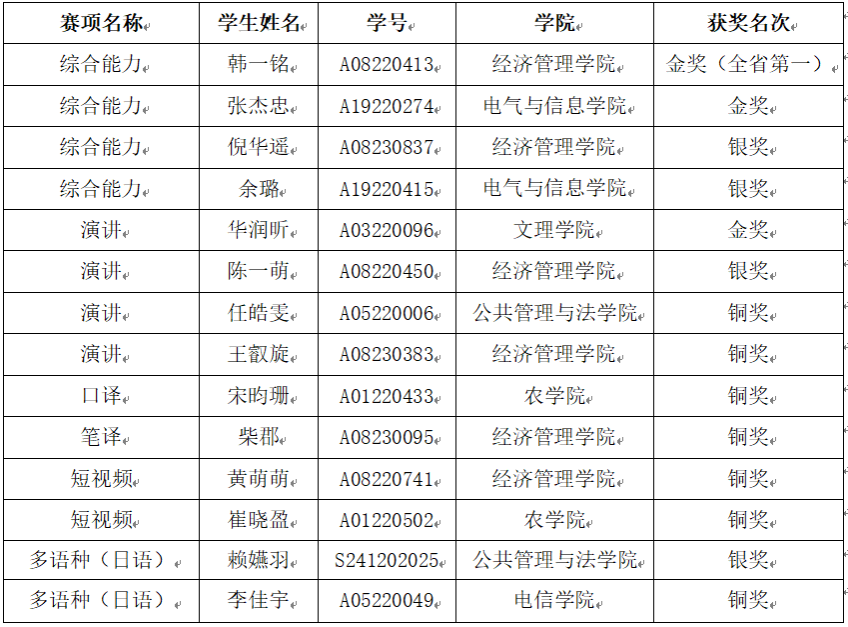 本届赛事分为综合赛组、演讲组、口译组、笔译组、短视频组、多语种组六类组别,赛事历时两个月,经过多轮比赛环节。校赛阶段,共有来自全校725名参赛选手,共评出校级特等奖8人,一等奖12人,二等奖20人,同时推荐14名选手代表学校参加黑龙江省赛区比赛。省赛前,文理学院外语公共教学部开设了赛前集中培训营,为参赛学生进行了赛事培训指导,并为晋级选手配备了“一对一”指导教师,进行针对性特训,让参赛选手能在省赛舞台中充分展现东北农业大学选手们的良好的精神风貌和专业水平。经过激烈角逐,经济管理学院韩一铭、电气与信息学院张杰忠、文理学院华润昕3名同学在全省39所高校的2万余名参赛选手中突出重围,成功晋级国赛,其中,韩一铭同学获得综合赛事组全省第一名的好成绩。