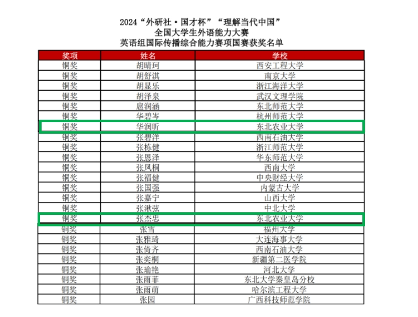 近日,2024“外研社·国才杯”“理解当代中国”全国大学生外语能力大赛总决赛在北京圆满落幕。大赛由北京外国语大学主办、外语教学与研究出版社承办。教育部高等教育司、中央宣传部国际传播局、北京外国语大学相关负责同志出席大赛闭幕式。东北农业大学文理学院华润昕、电气与信息学院张杰忠两位同学获得大赛英语组国际传播综合能力赛项国赛铜奖。