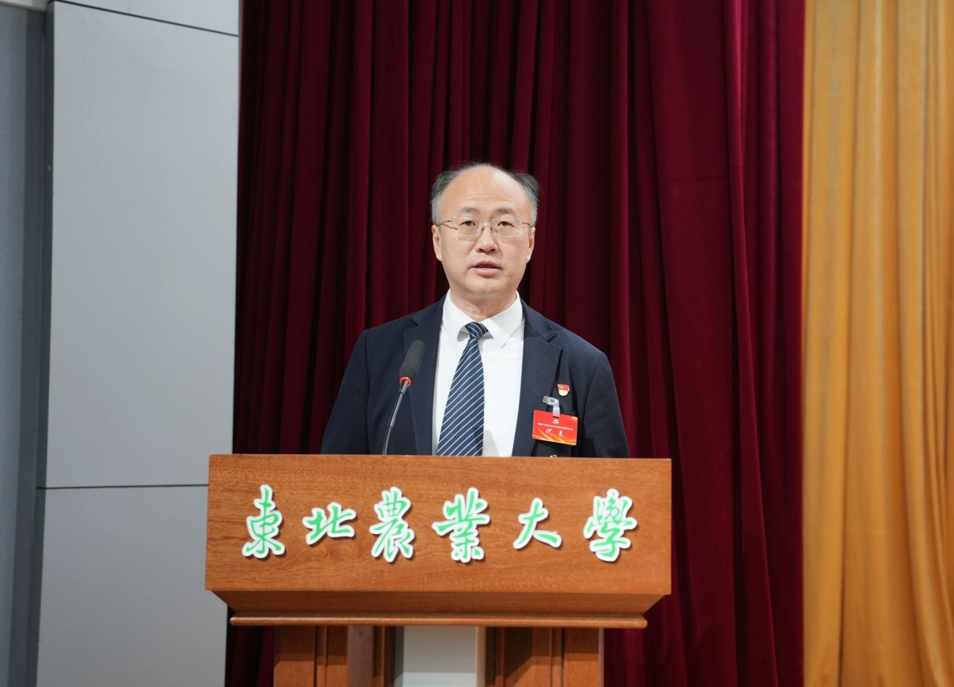 校党委书记付强代表中国共产党东北农业大学第三届委员会作题为《高举旗帜 真抓实干 为奋力实现世界一流大学“东农梦”而团结奋斗》的工作报告。报告共分四个部分:一、第三次党代会以来的工作回顾与总结;二、乘势期远,坚定一流大学建设目标;三、保持定力,走好东农特色发展之路;四、以高质量党建引领高质量发展。