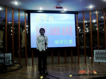 演讲过程中,选手们通过一个个真实感人的故事,用淡定而深情的诉说,完美地诠释了“感恩”这个主题。每位选手都为比赛做了精心准备,他们独具特色的演讲方式,以及自然流露的真实情感,感动了现场的所有人。整场比赛精彩不断,赢得了在场同学一次次热烈的掌声。战宇航同学演唱的一首《母亲》,将会场的气氛推向高潮。周庆鑫同学获得了本次比赛的第一名。在刘敏同学《感恩的心》的歌声中,本次演讲比赛落下了帷幕。