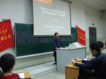本期论坛共分两部分。首先,由王勇副教授就“黑龙江省、河北省农村合作经济组织制度创新及其实践效果”进行主题演讲,他列举了大量下乡调研到的关于农民合作社的案例数据,阐明了建立农村合作经济组织对增加农民收入和建设社会主义新农村的重要作用。接下来,新农村建设研究会的会员就研讨主题进行讨论,然后推选出学生代表谈自己对农村合作经济组织的看法和建议,王勇副教授再对同学们的观点一一进行点评。
